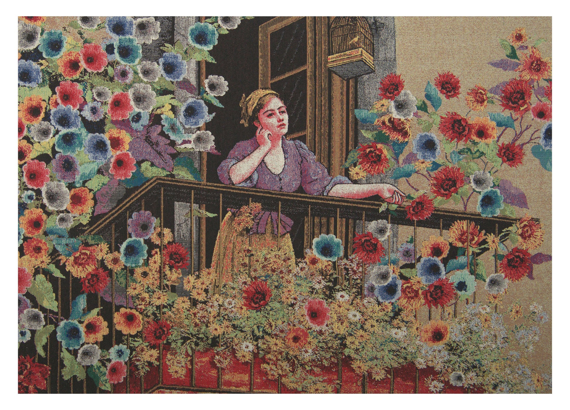 Big beautiful blooms surround a lovely maiden peering out from her balcony on our Flower Maiden Stretched Wall Tapestry. This wonderous artwork brings brilliant color and dreamy visuals to the home or office with its wonderfully woven texture and composition. Hang this lovely piece in the entry, living room, or bedroom for a eye-catching artwork you and your guests are sure to enchanted with. It comes ready to hang and is made of 80% cotton/20% viscose for a silky texture. The stretched wall tapestry is backed and finished on the edges. This tapestry is imported.