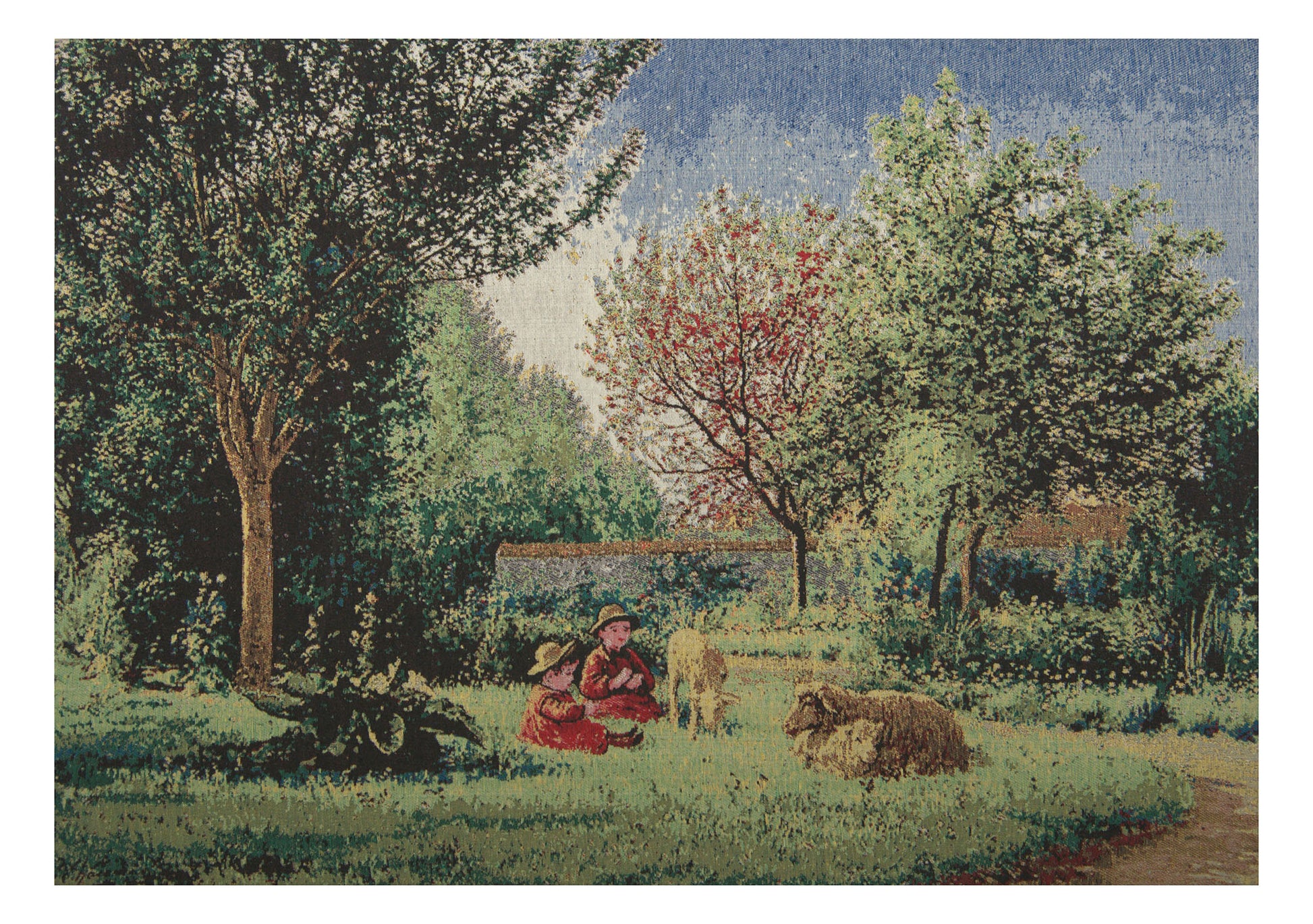European pastoral scenes have long been a beloved theme in paintings and artwork after the Renaissance period. Today’s we love bringing these peaceful images of serene country settings to our homes. Our Afternoon in the Pasture stretched wall tapestry brings the same beauty home with an inviting scene of two children sitting by a calf and sheep surrounded by blooming bushes and trees on a summer afternoon. Circa 1800s, this French tapestry is woven from cotton/viscose blend in vibrant hues of red, blue, green and rust. The stretched wall tapestry is backed and ready to hang. This tapestry is imported.
