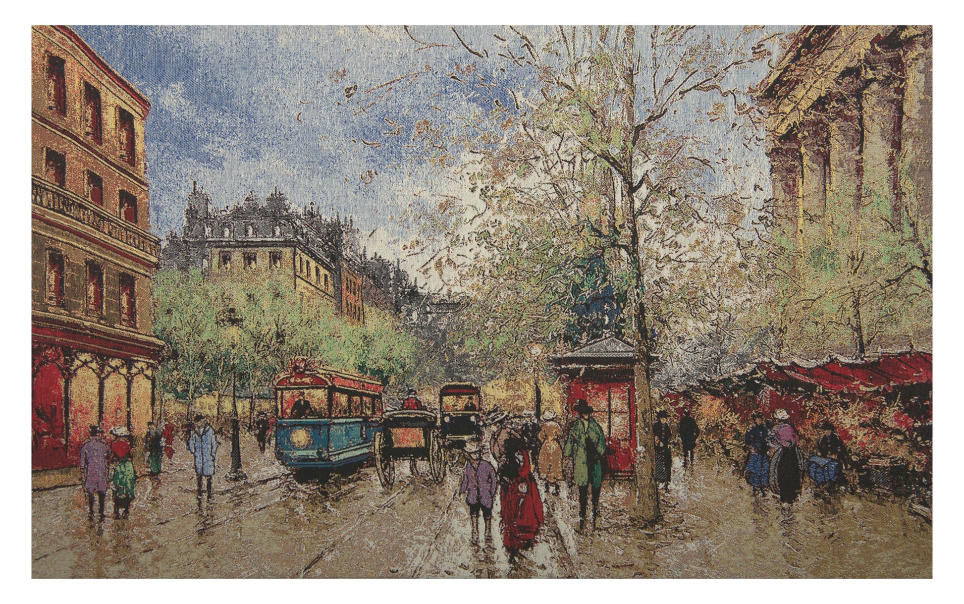 Taking inspiration from the reflective Paris streets scenes of Antoine Blanchard, our Rainy Day in Paris Tapestry replicates its beauty exactingly. The artist created his inspired paintings in the early 1930s working in his own unique style inspired by artist Edouard Cortes. This particular work depicts a busy city street filled with vehicles, animals and pedestrians. The tapestry is carefully woven in cotton with viscose added for a silky feel. It comes ready to hang with a finished backing. It is imported.