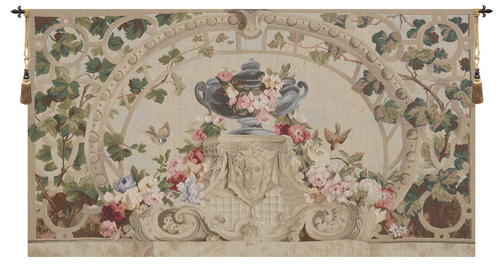 The original, Beauvais Feuilles Vertes, or Green Leaves, was woven at the Manufacture de Beauvais in the middle of the 19th century for the dining room of the Elysee palace. (Now residence of the French President) This French impressionist jacquard woven tapestry wall hanging represents a bowl surrounded by a splendid blossoming floral crown framed with green foliage of climbing ivy. This lovely piece is the perfect addition to your home decor motif.
