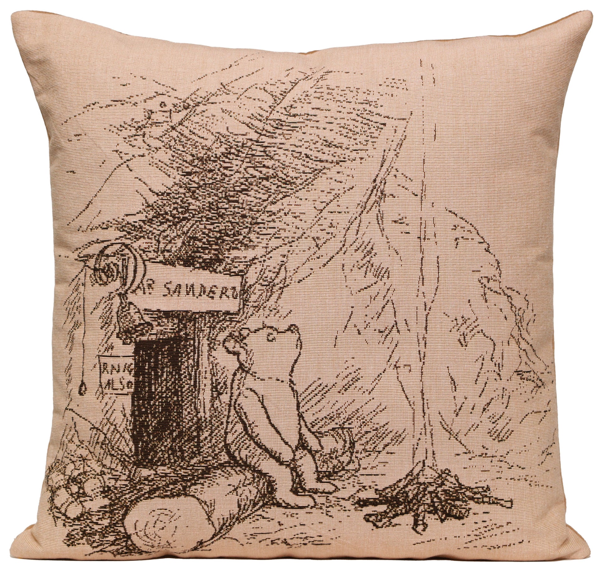 The French jacquard woven cushion cover, "Winnie at the Firecamp" captures the essence of childhood nostalgia. This decorative pillow cover features a simple yet endearing image in classic tapestry form, making it a timeless addition to any home decor. With intricate lines on a soothing beige background, the design shows Winnie-the-Pooh sitting in front of a campfire and gazing at the sky. This charming illustration recalls the cherished tales of A.A. Milne, evoking fond memories of childhood adventures and enduring friendships. Adding a touch of whimsy and warmth to any room, this throw pillow cover blends seamlessly with various interior styles. Ideal for recapturing the magic of childhood, it serves as a perfect reminder of the simple pleasures that shaped our early years.