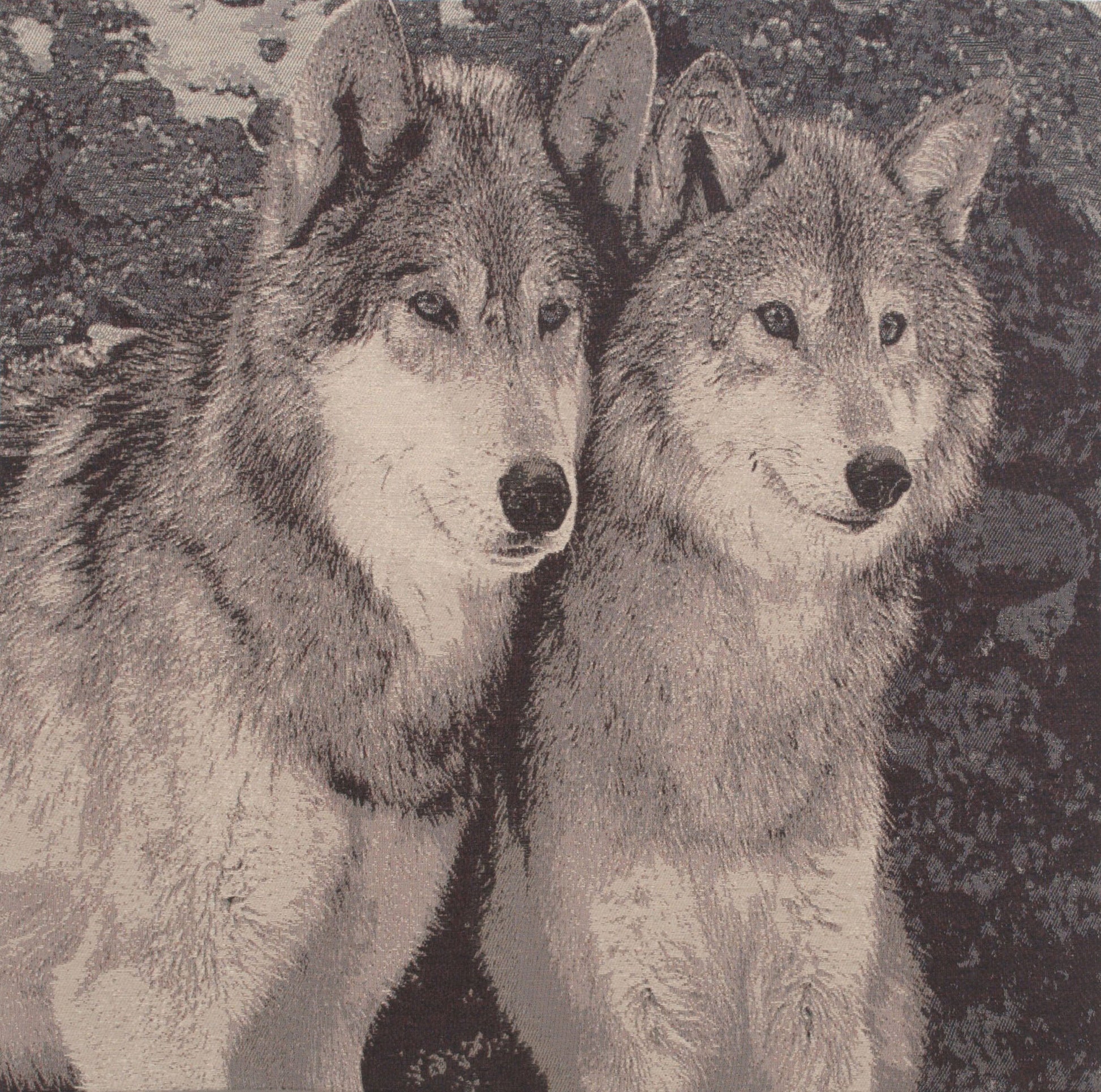 Winter's Warmth is a monochromatically toned tapestry depicting two beautiful wolves standing side by side. This stretched wall panel is the perfect accent to any home, office, cabin, or child's room.