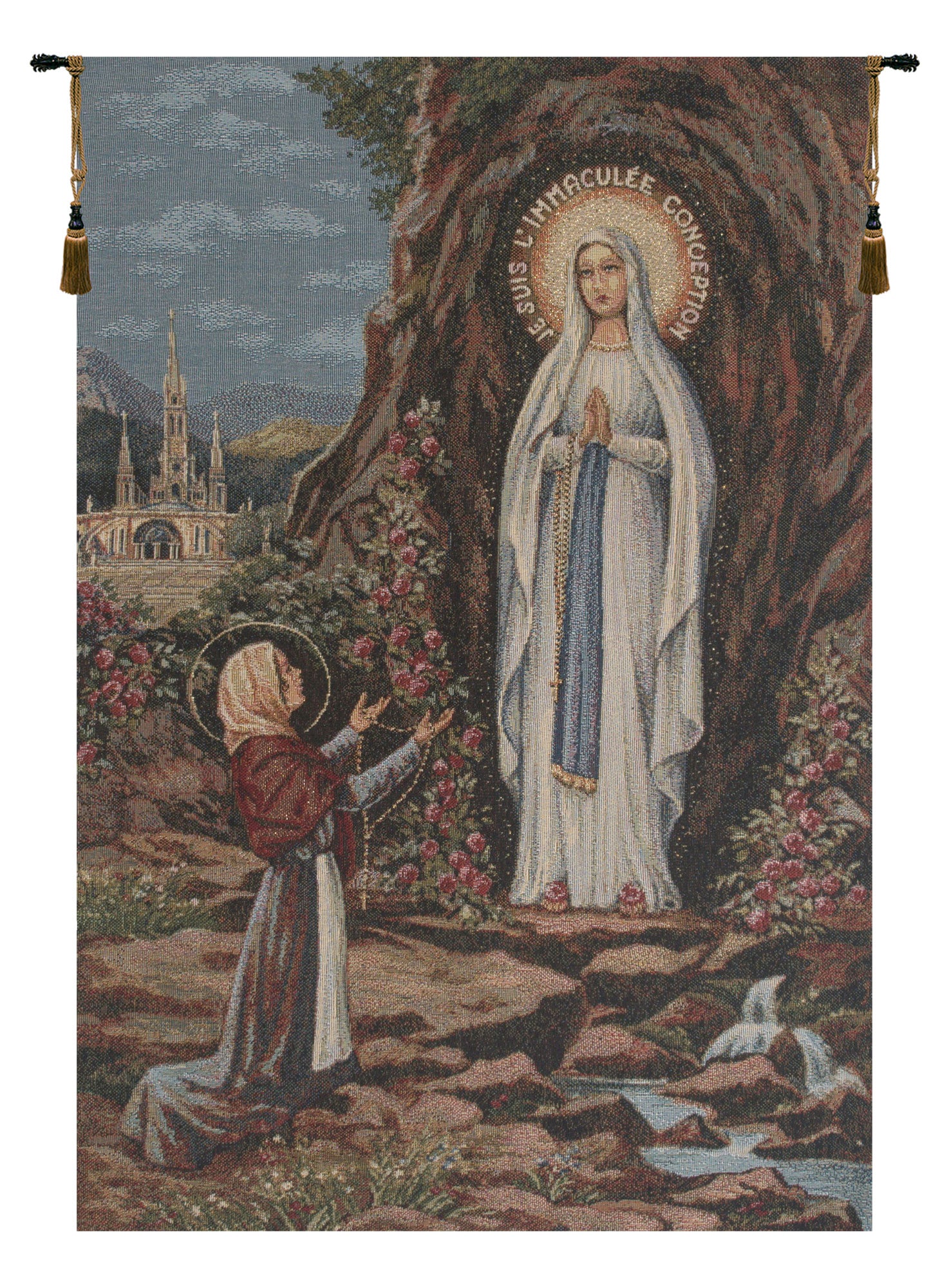 Apparitione Lourdes Italian woven tapestry features an apparition image of the Blessed Virgin Mary as described by Saint Bernadette Soubirous, a 14-year-old miller's daughter from the town of Lourdes in southern France.