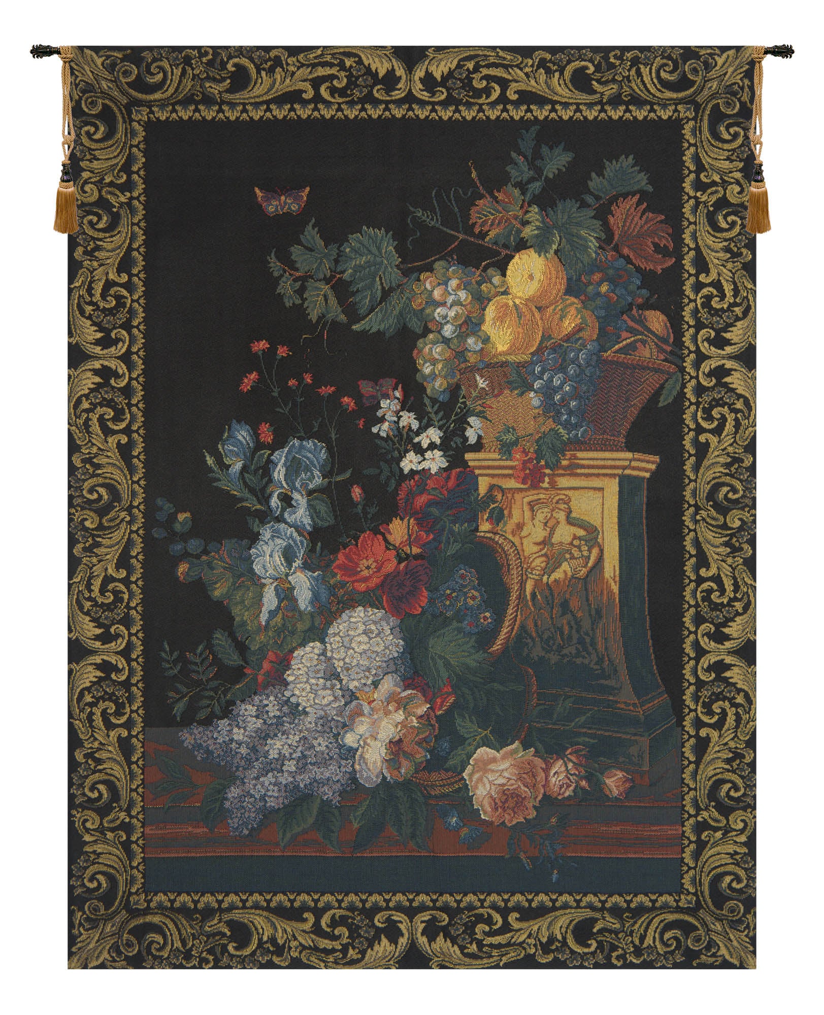 Bouquet on a Column is Belgian made jacquard woven wall tapestry This still life flower and fruit composition is a representation of the oil painting by Cornelis Van Spaendonck (1756-1840). This classic and formal decor presents an opulent display of fruit upon an ornate pedestal, a bouquet rests before it upon a dark background; edged with an ornate golden border.