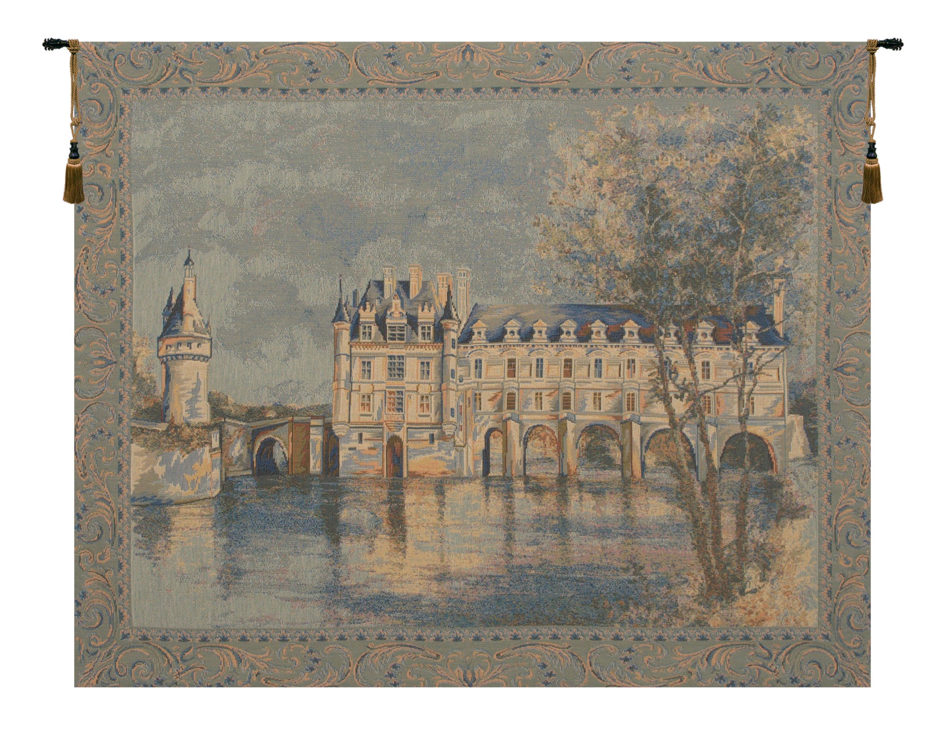 Chenonceau Castle is a Belgian made jaquard woven wall tapestry. The Chateau Chenonceau is a renowned French Heritage site, the castle spanning the River Cher near the village of Chenonceaux in the Indre-et-Loire département of the Loire Valley in France. It was built in 1513 during the Renaissance. Diane de Poitiers and Catherine de Medici lived in this magnificent castle known for throwing elaborate nighttime parties.