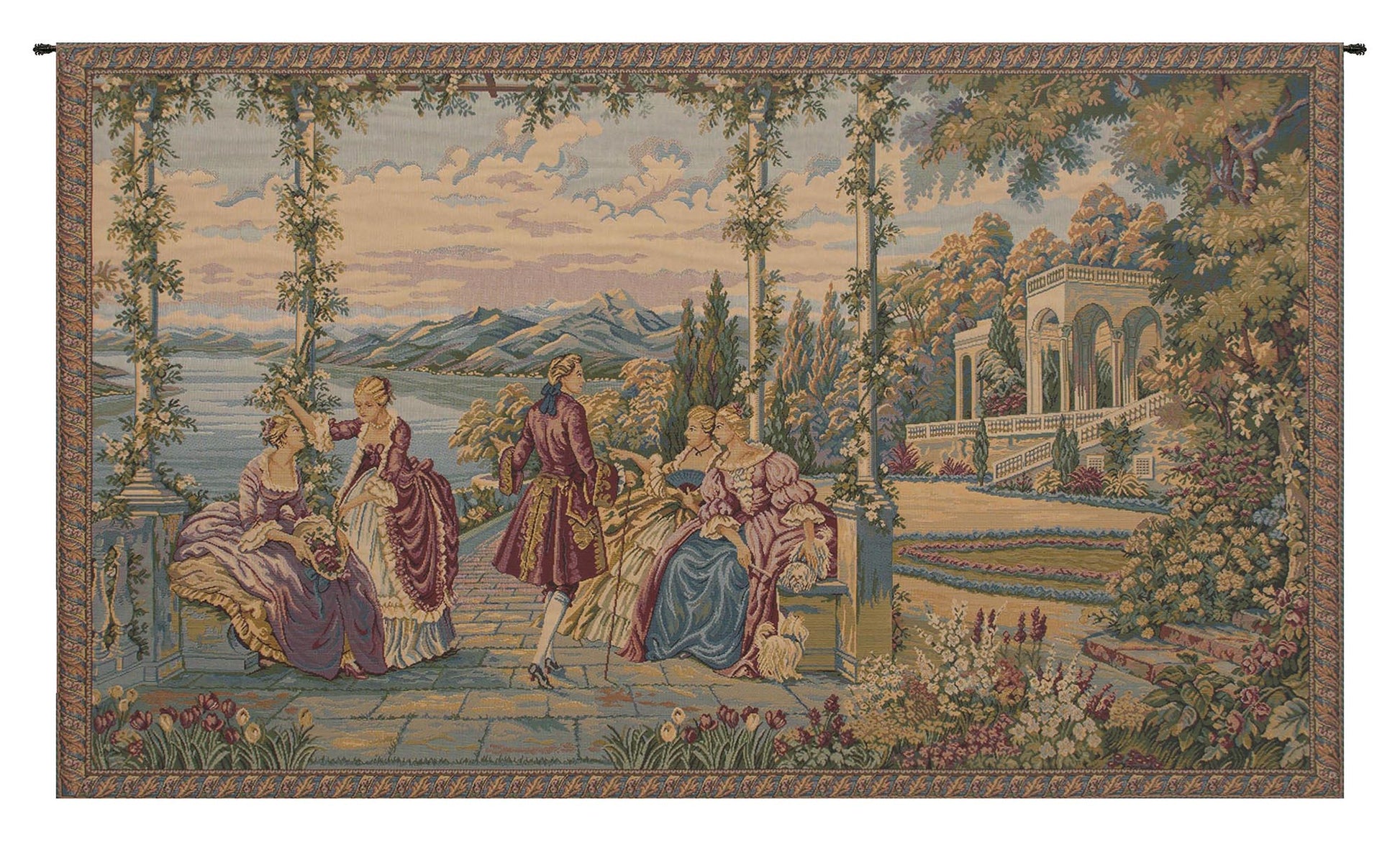 The plush gardens and brilliant blue waters of Italy’s Lake Como provide the backdrop for a trio of noble ladies and a gentlemen to enjoy the terrace view. Taking inspiration from three different 17th century paintings, our single Dame e Lago tapestry marries the three into a single scene of merriment and beauty. The vista alone is a striking array of color and composition with the regality of man’s Renaissance architecture soaring above nature’s rolling hills and deep blue waters. The tapestry will bring all into your home for you and others to enjoy for decades to come. The tapestry is woven in cotton, viscose, and polyester. Backed with lining and tunnel for easy hanging. Woven in Italy.