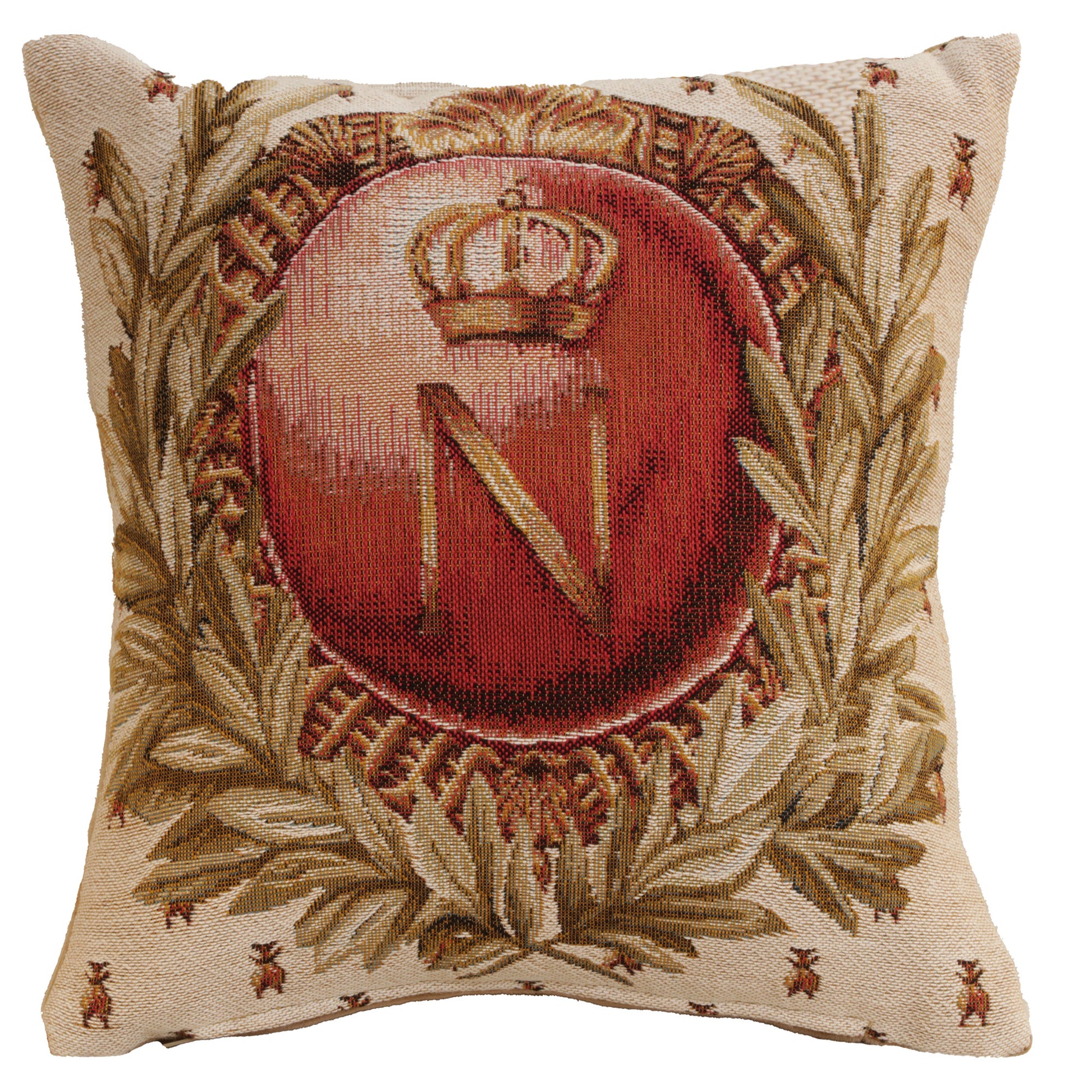 Elegant European jacquard loom woven tapestry cushion cover featuring an emblem of the Napoleon medallion. The array of neutral tones of cream and beige are tied together with the faint olive tones in the laurel leaves and the shades of red and burgundy in the medallion. A wonderful piece for your home decor motif.