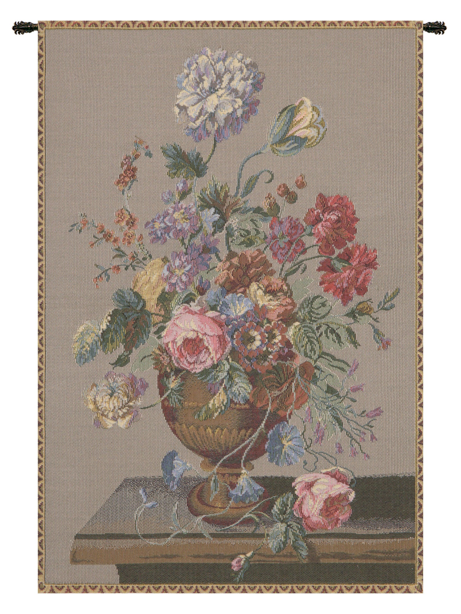 Still life is a Belgian made jacquard woven wall tapestry. This classically formal floral still life presents a vase of boldly colored flowers upon a light background and is completed with an acanthus leaf border.