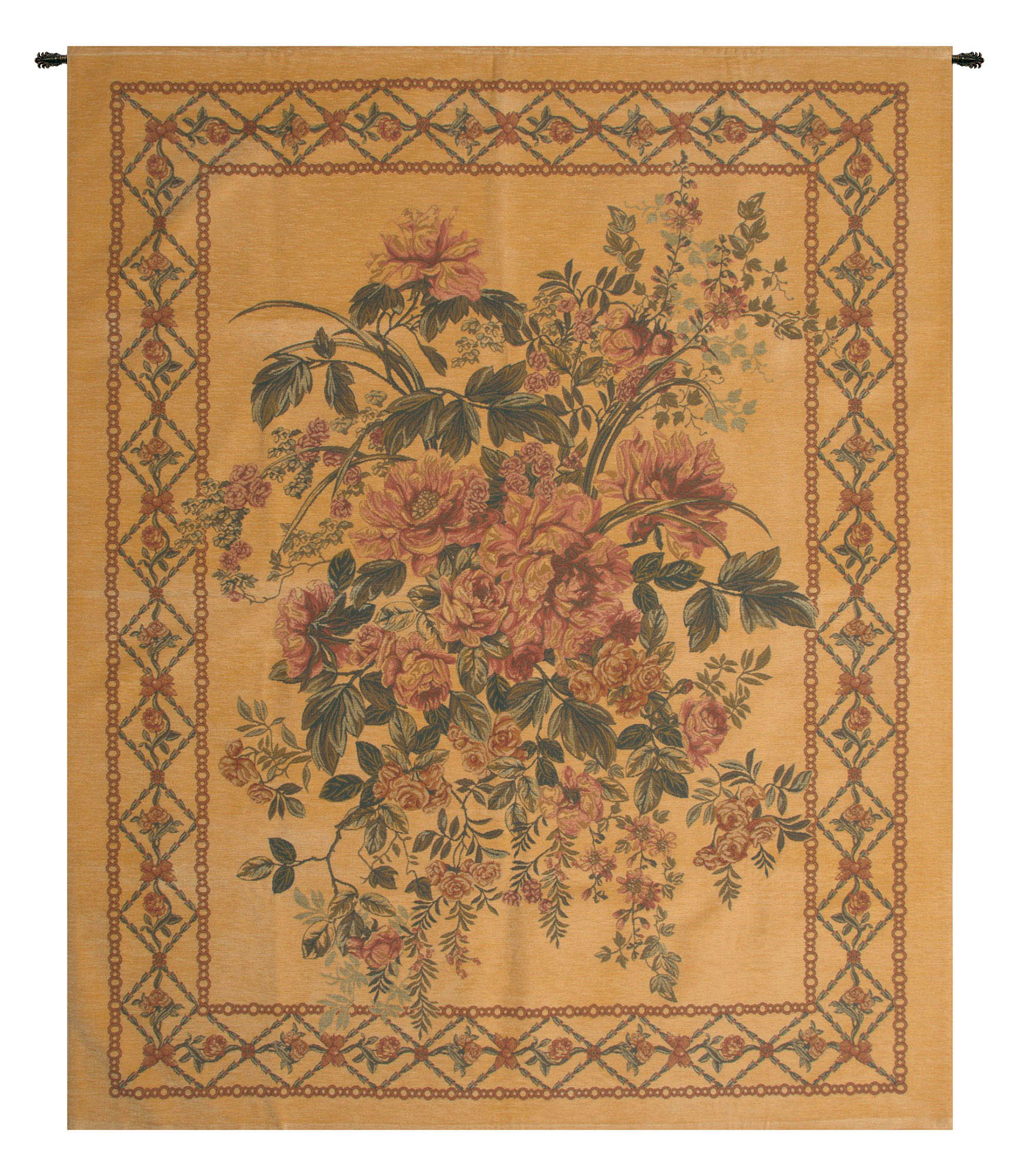 Floralie is a Belgian made jacquard woven wall tapestry. A cascading bouquet of roses is bordered by garlands upon a rich golden chenille.