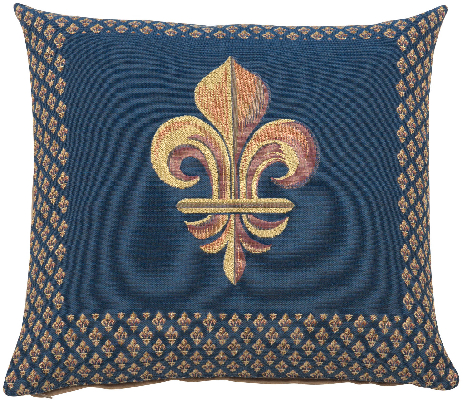At its center, a golden Fleur de Lis commands attention, woven with metallic threads that catch and reflect light, creating a captivating interplay of brilliance, placed upon a striking deep blue background. The intricate detailing extends beyond the central motif, as the cushion cover is framed by a series of smaller Fleur de Lis, evoking a sense of heraldic splendor.