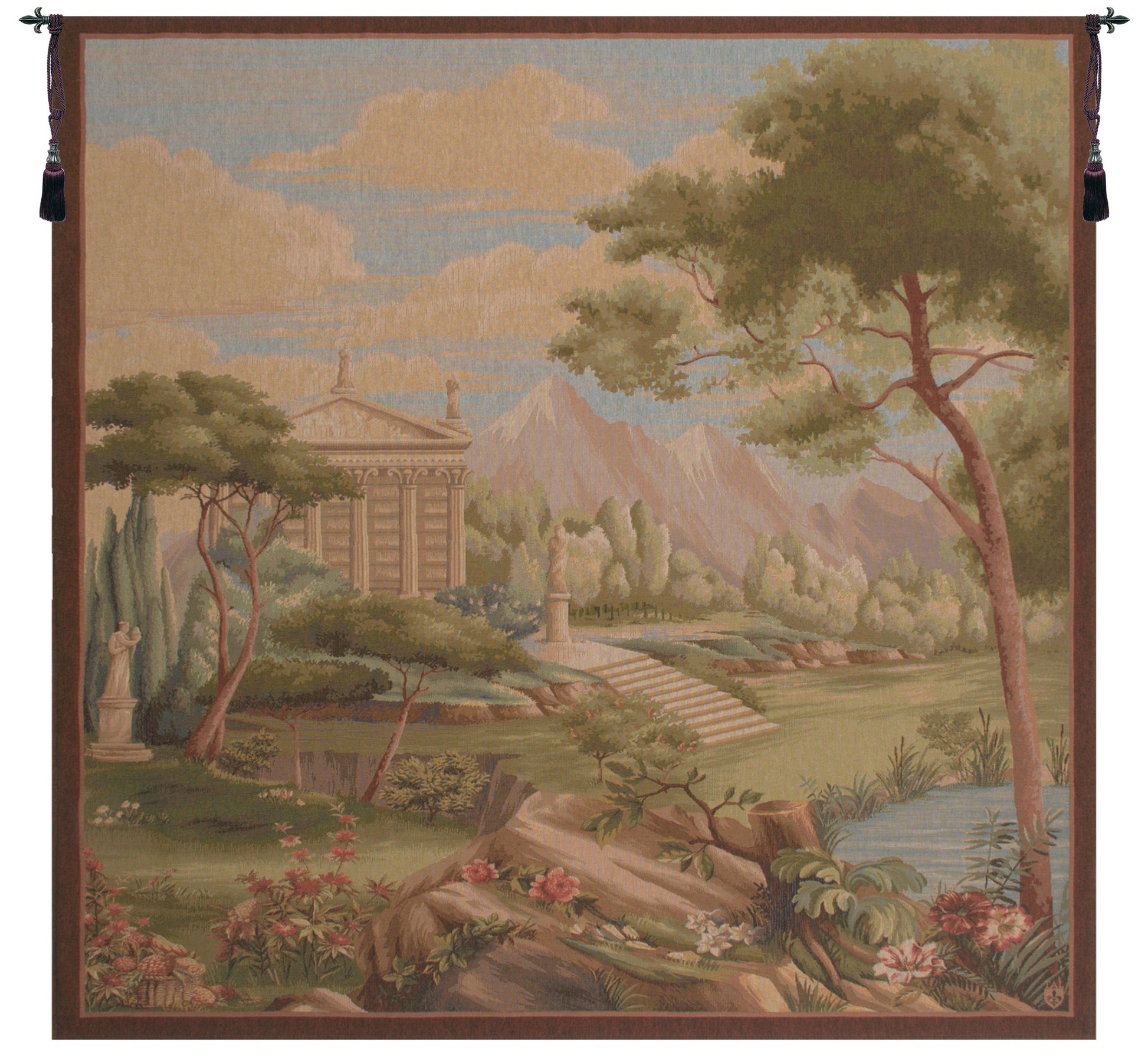 Taking inspiration from the historic tapestries of the 15th century Gobelins Manufactory in France, our Jardin PanoramiqueTapestery boasts finely woven details in soft classic colors. The focus of the wall hanging is a royal garden with intricate flowers, trees, and marble structures depicted ornately. It’s ideal for hanging in a room with few or no windows to create the allusion of a window overlooking a breathtaking landscape scene. Made from soft cotton/wool blend for a natural appearance and feel. Woven in France with lined back and tunnel top for easy hanging.