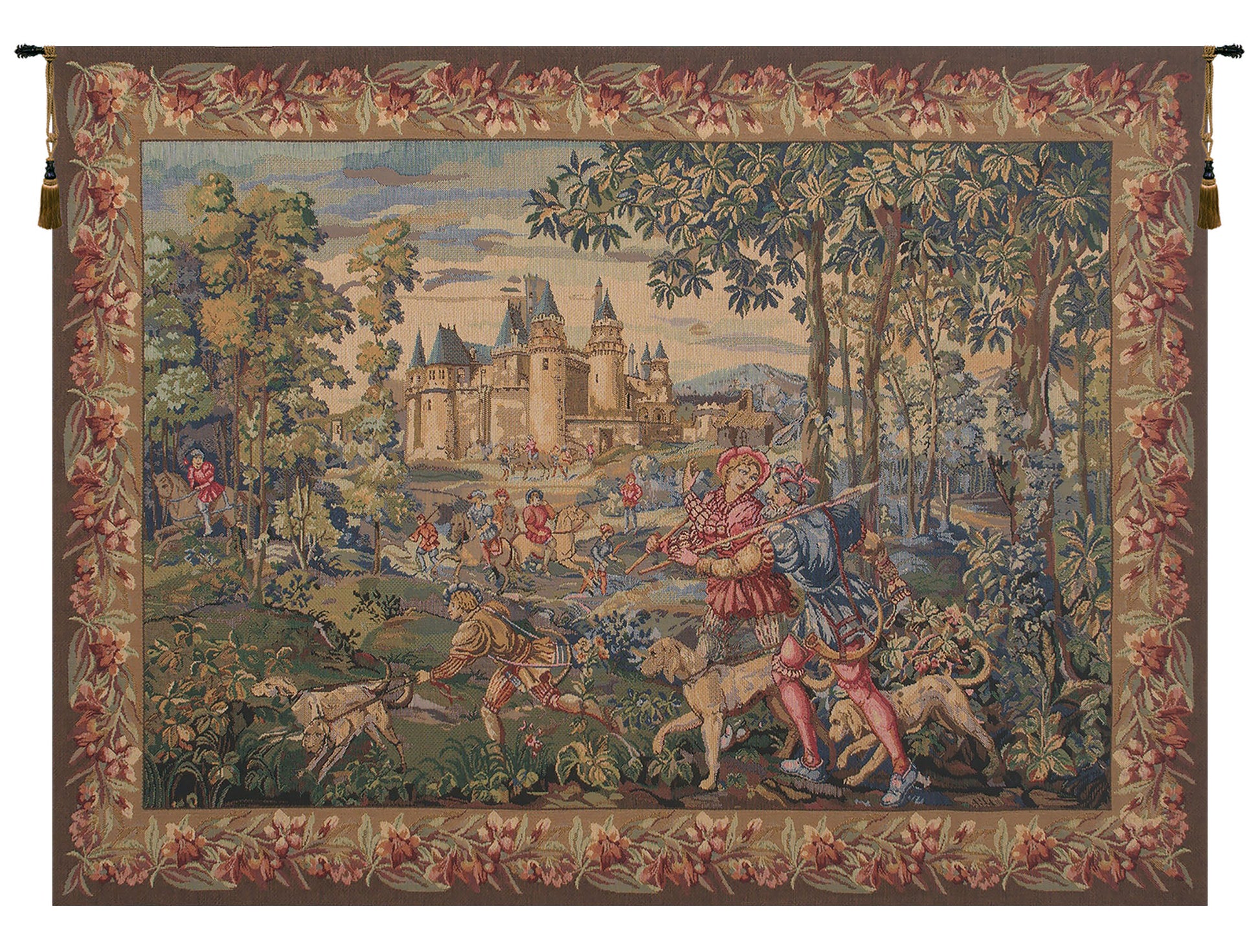 La Chasse Belgian tapestry features a scene of the castle of Pierrefonds with noblemen and their dogs and horses preparing to go for a hunt.