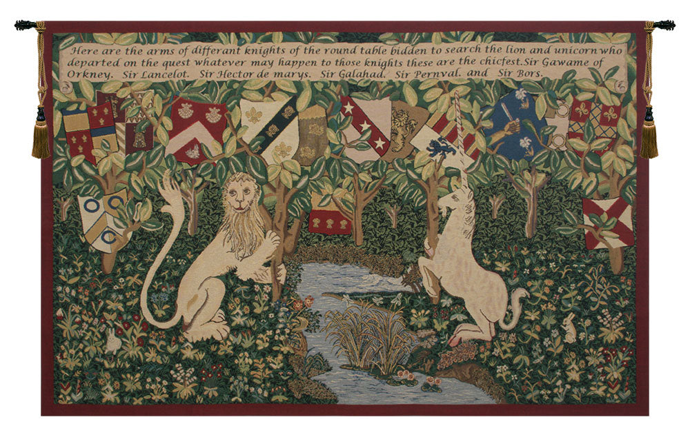 Arms of the Knights tapestry tells the tale of the 24 knights of the round table sent to search for the unicorn. In this tapestry the lion represents the knights as well as the shields, or "escutcheon" in the background.
