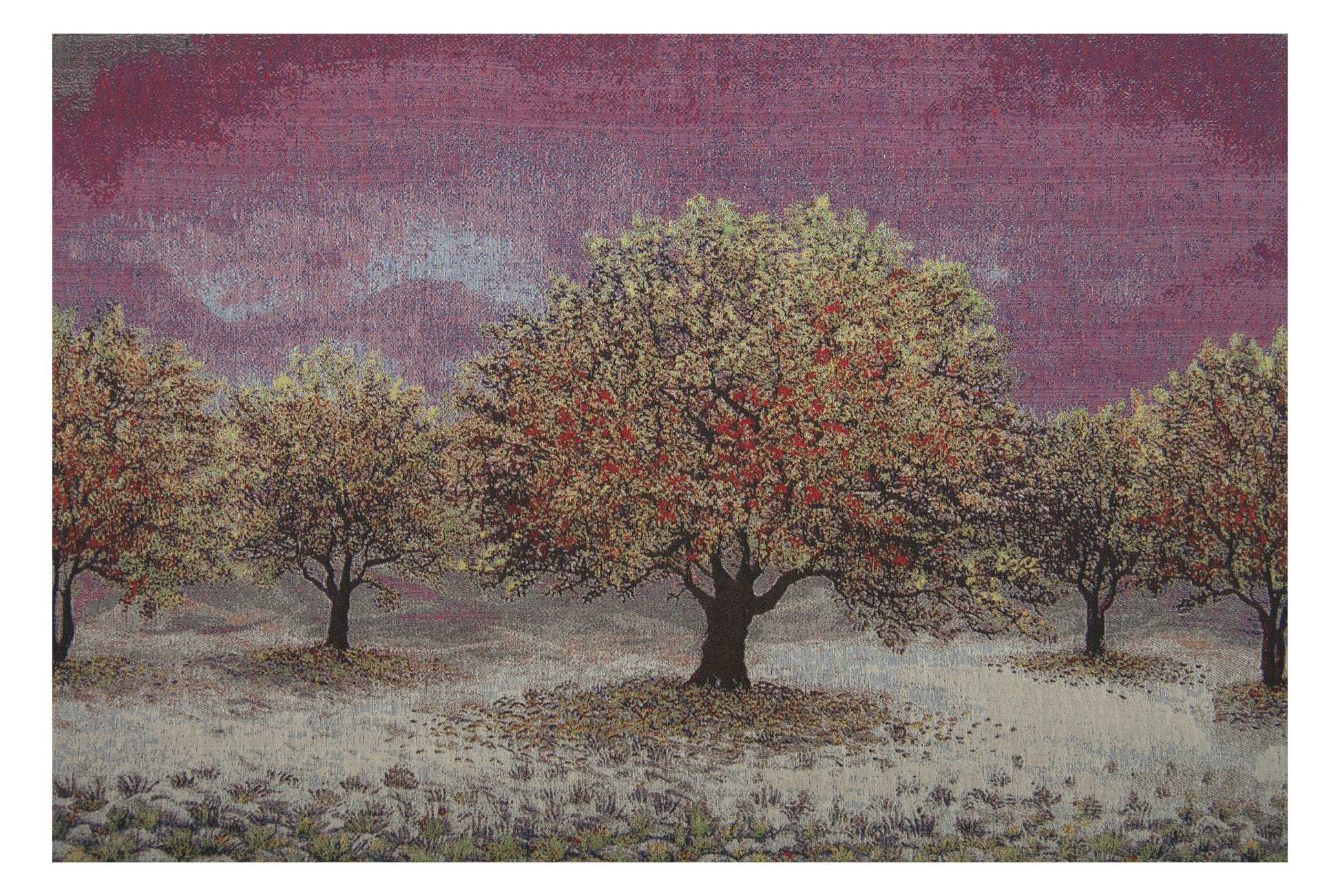 Impressionist in style, hopeful in sentiment, our Anticipating Spring Stretched Wall Tapestry brings nature strength and beauty to life. This imported wall tapestry boasts an orchard with red buds and new greenery eagerly awaiting warm sunny days. The trees are shown sitting under a moonlit sky with a last dusting of snow on the ground below. The peaceful nature of the piece is sure to bring a calming presence to the bedroom or study. It is woven expertly using a blended yarn of cotton/polyester/viscose. Buy for yourself or give as a gift. Imported.