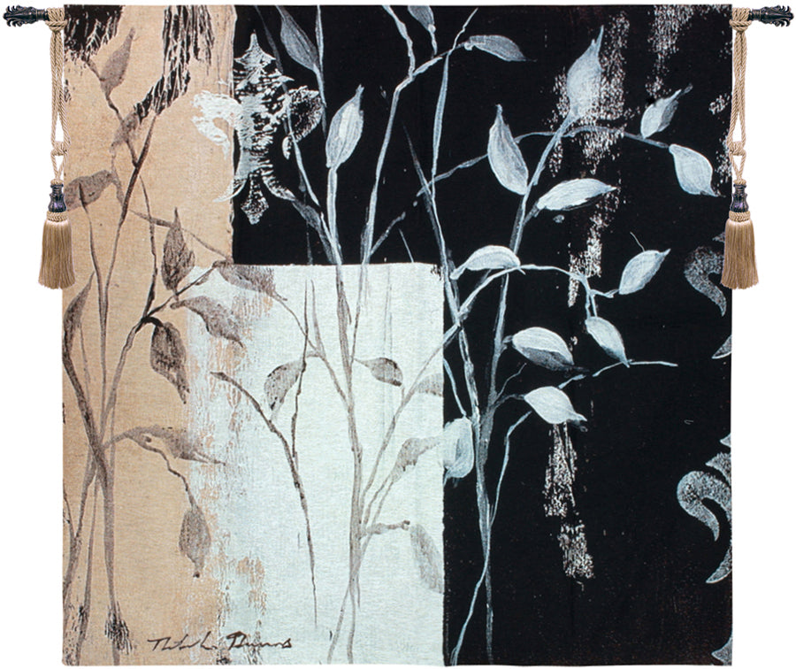 African Leaf tapestry features a three toned black, white and beige background with white wispy leaves in the foreground.