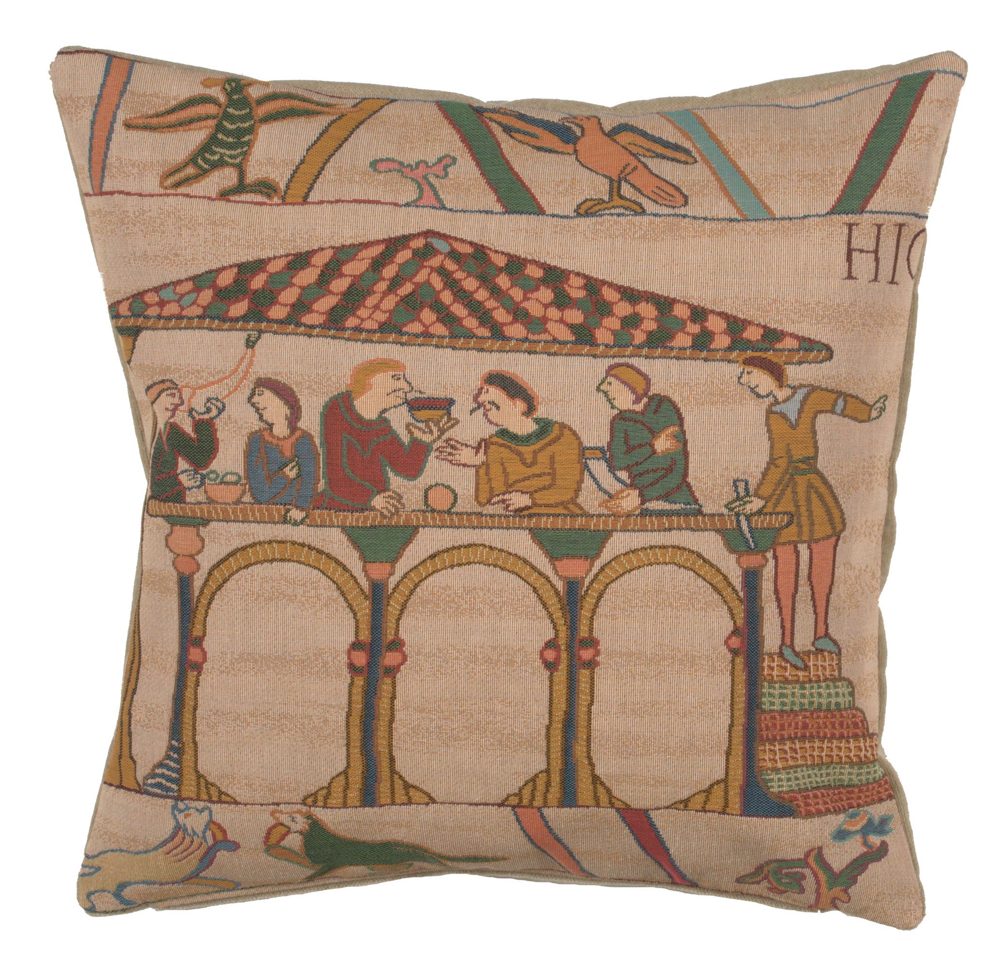 This decorative European jacquard tapestry cushion cover, Bayeux Le Repas, is an extract of Queen Mathilde's Bayeux tapestry. The original, some 230 feet long, is in the Bayeux museum in Normandy. It describes how England was conquered by Normans. Also known as L'Embarquement.