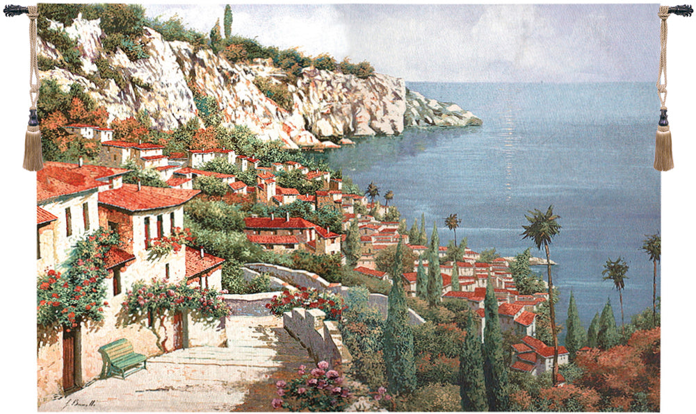 Bellagio Park tapestry will give you the feeling of being whisked away to a seaside community composed of villa style homes with red terra cotta roofs on the bright blue water's edge.