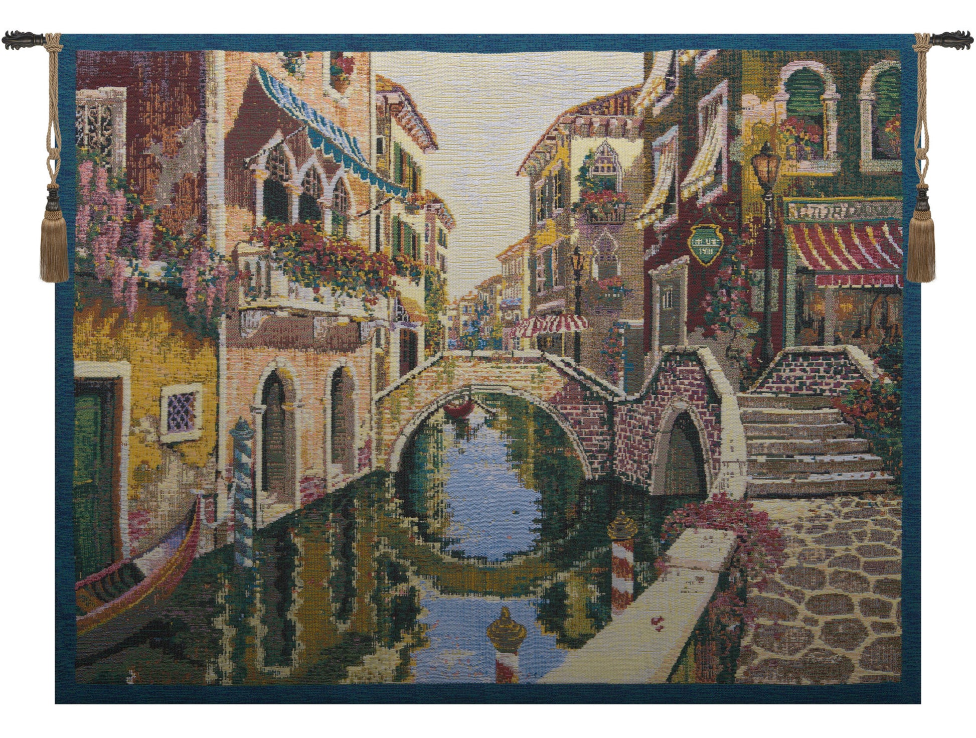 Venice, or Venetie, is a Belgian made jacquard wall tapestry. It is a reproduction from a painting of Bob Pejman, endorsed by the artist himself. The city of canals, made up of islands joined by bridges, is a phenomenon of cityscapes, and here we see the colorful sienna colored buildings, and cobblestone streets that Venice is so noted for. Flowers flow from every corner and add to the mystical aspect of a city mirrored at the floor. Also known as Canals of Venice.