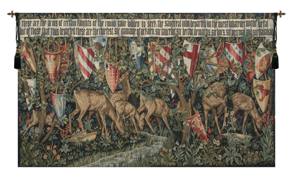 Verdure with Reindeer is a European jacquard wall tapestry. The original tapestry was designed by Edward Burne Jones and woven by Morris & Co. It is one of the six panels illustrating the story of the Quest for the Holy Grail. this piece represents the arms of the Knights of the Round Table: Sir Gawaine, Lancelot, Hector, Perceval, Bors and Galahad among others.