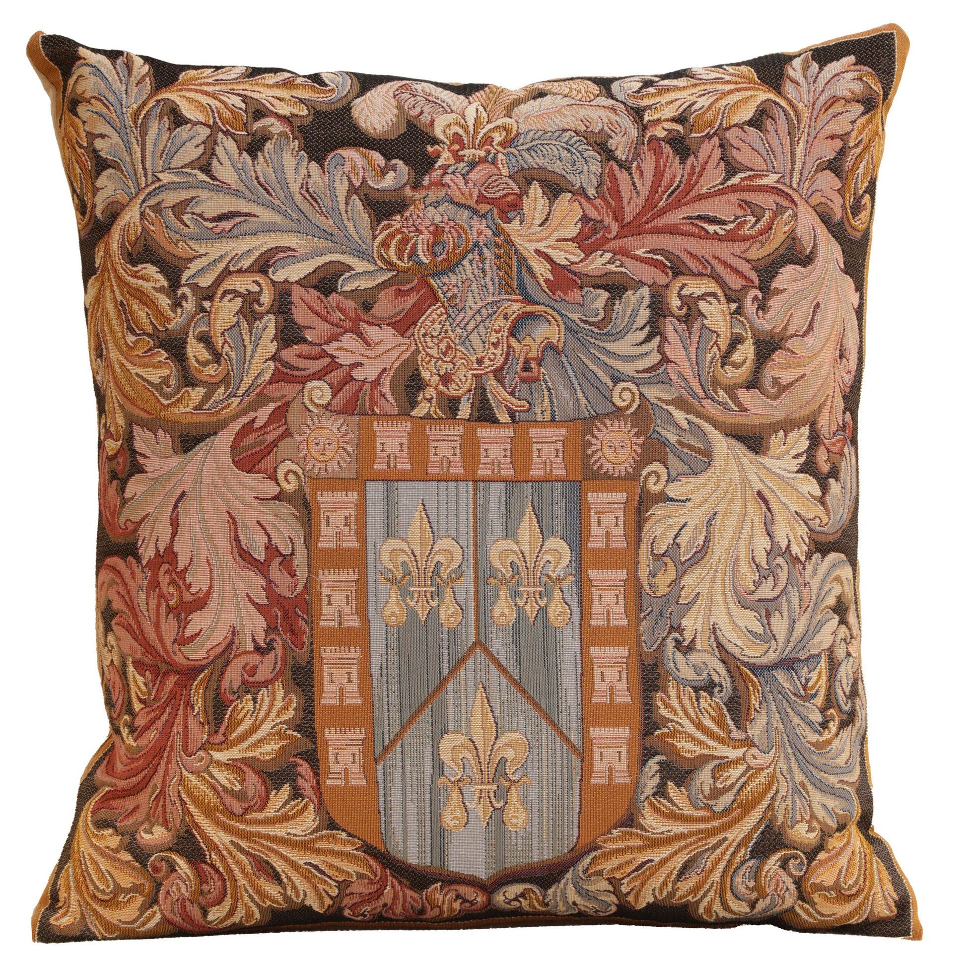This elegant European jacquard tapestry cushion cover represents the crest of the De Nagera family, originally woven in Bruges in the 16th century, it is a coat of arms surrounded by colorful interwoven leaves.