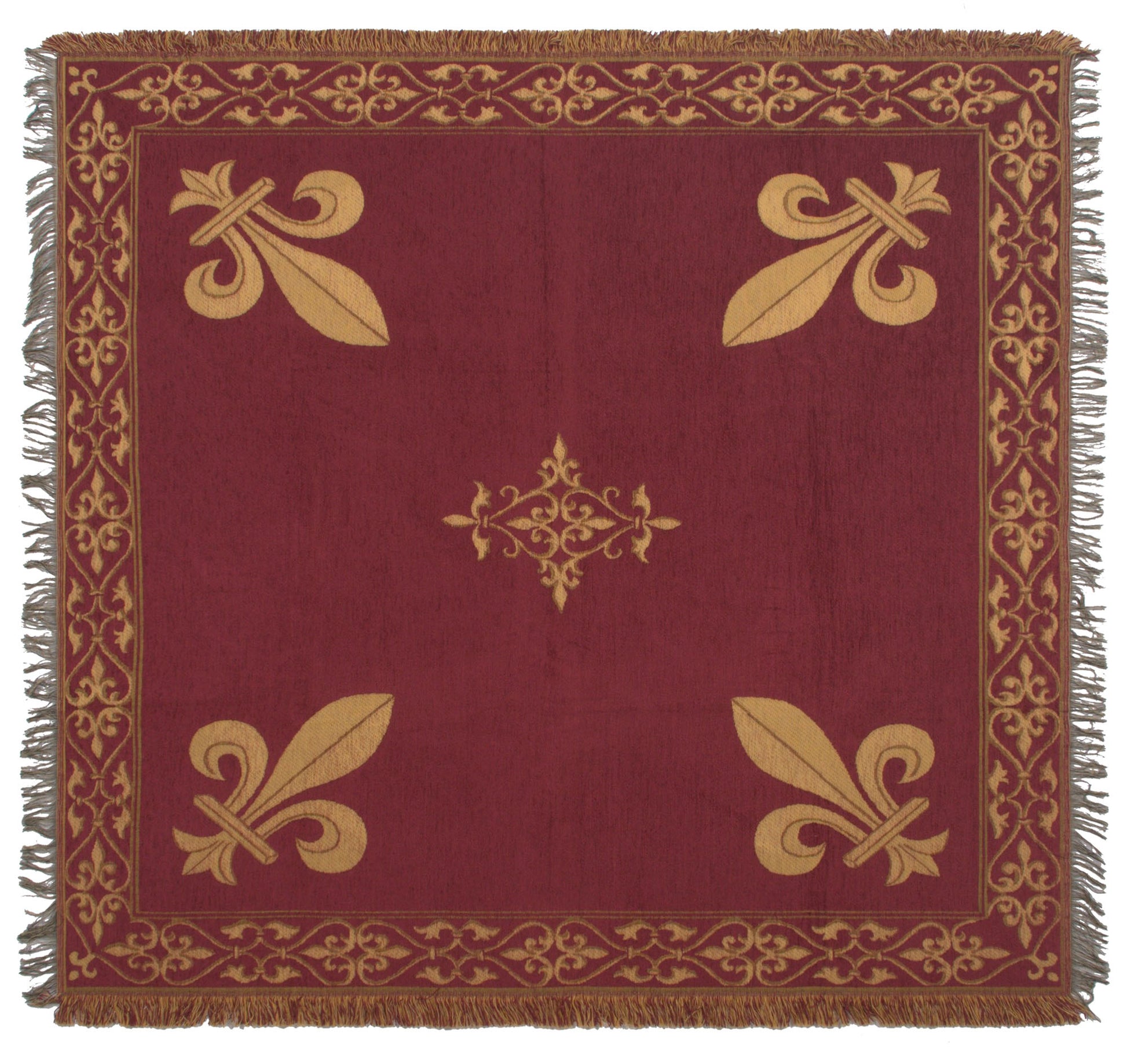 Fleur de Lys Red woven European throw features a dark Red background with gold Fleur de Lys in all four corners.