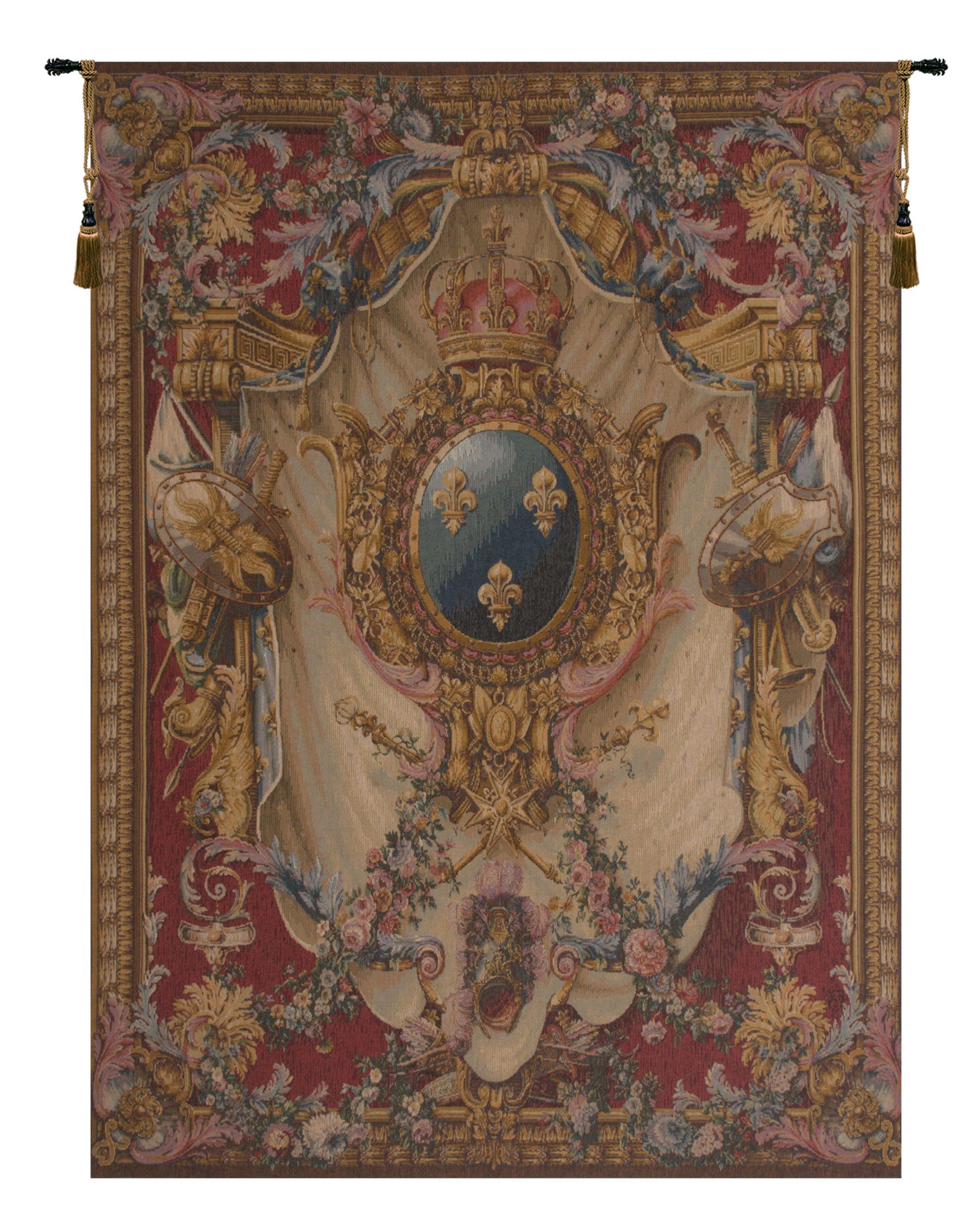 This French wall tapestry, Grandes Armoiries Red, was designed by Pierre Josse Perrot. Different versions were woven at the Gobelins at the beginning of the 18th century. The original pieces are at the Louvre and at the Versailles castle. The arms are those of the French Kingdom: three gold fleurs de lys on azure blue, woven on a red background. Also known as Grandes armoiries fond rouge.