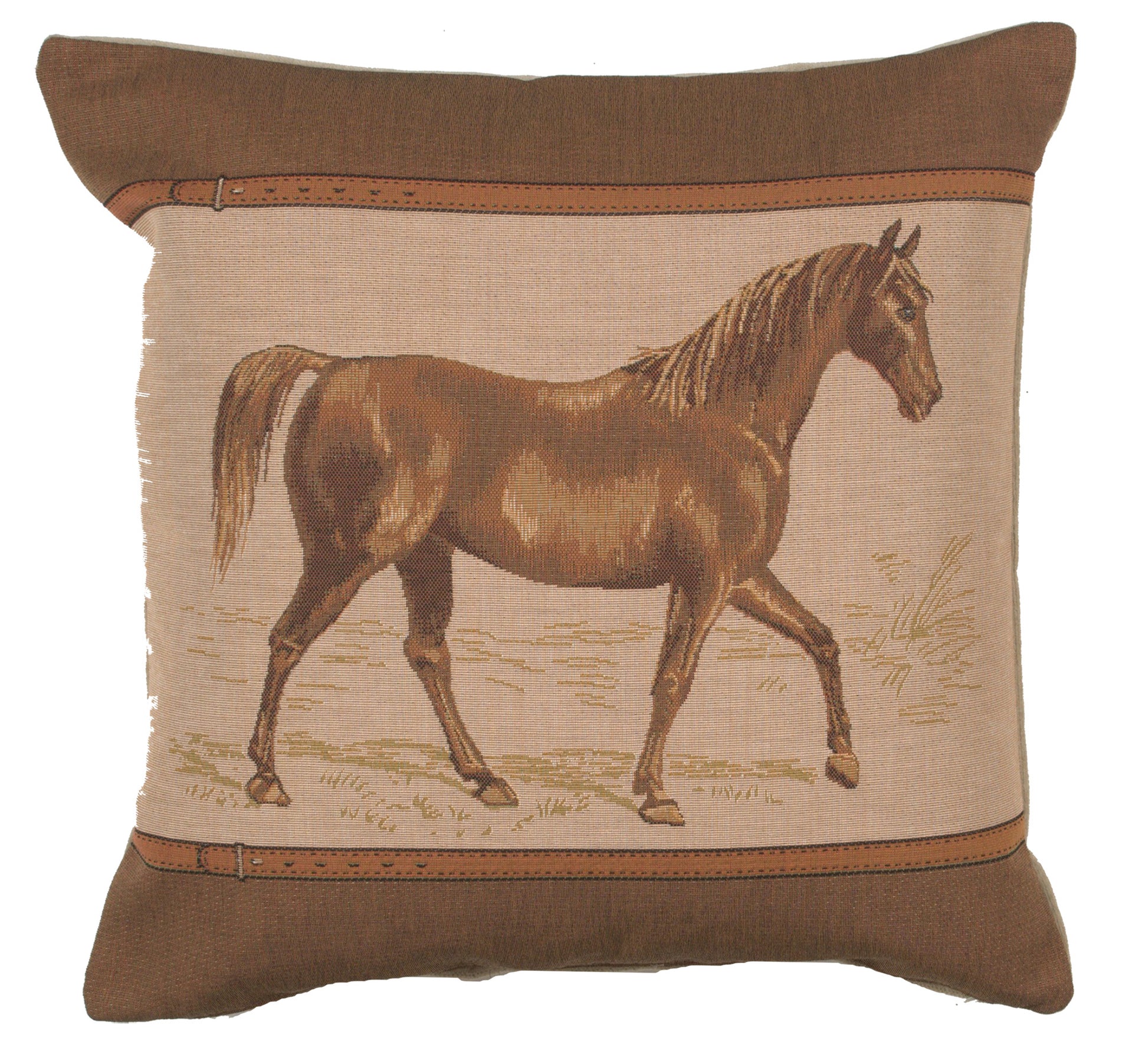 Horse Belt, or Cheval ceinture is a fine art European jacquard cushion cover displaying a handsome unbridled chestnut horse in profile. The background is cream and is bordered by a thin belt of tack above and below and a darker brown border at top and bottom of the panel.