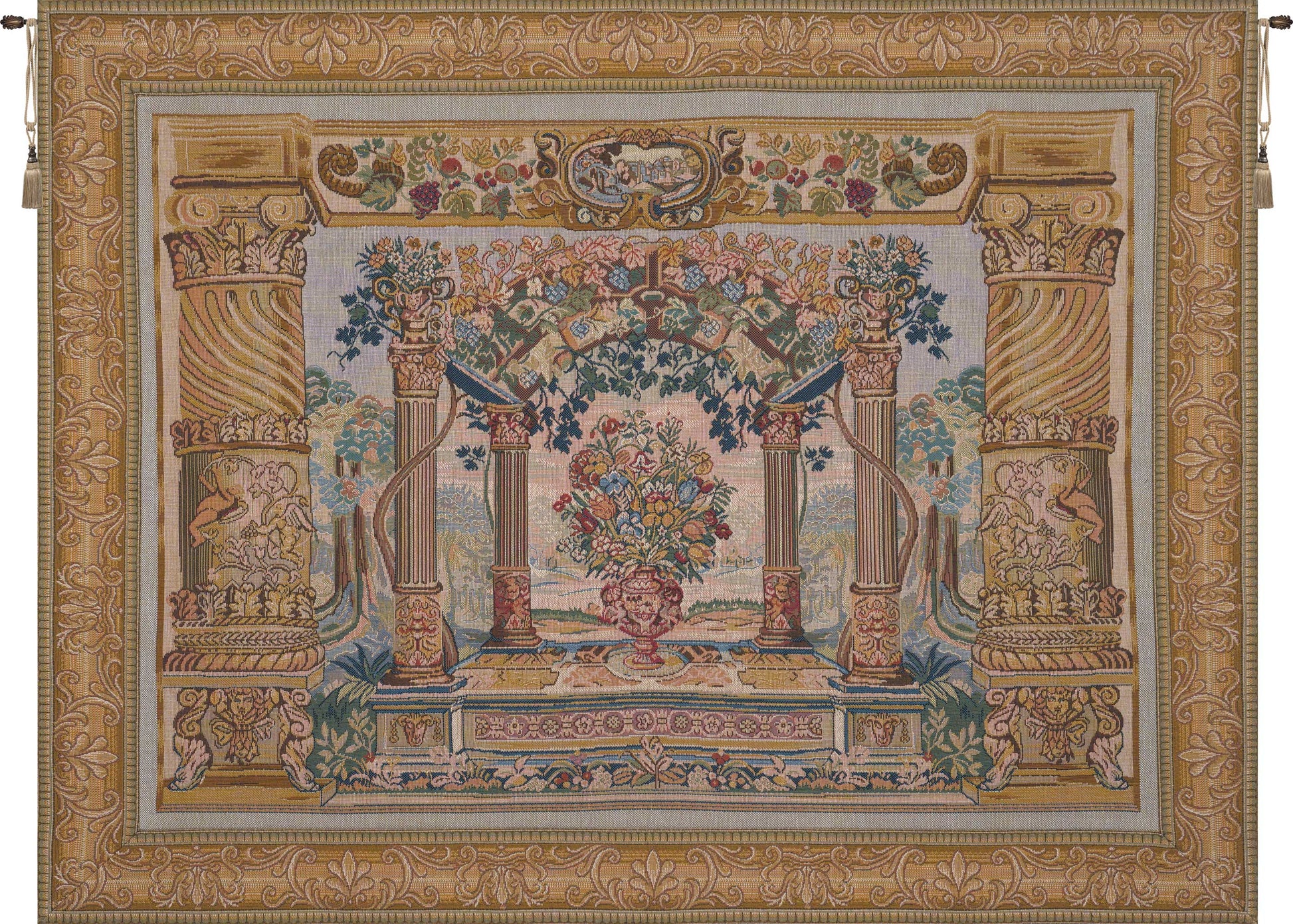 The original of this French impressionist jacquard woven tapestry wall hanging; Terrasse with Border I, was woven in Antwerp in the early 17th century. It represents a bouquet of flowers in a copper bowl surrounded by columns and green foliage. It has an arabesque border and is also known as Terrasse, Beige. The ornate imagery is captured by our skilled artisans, creating a feeling of luxurious beauty that ensorcels the eye. This piece makes a perfect addition to your home decor motif.