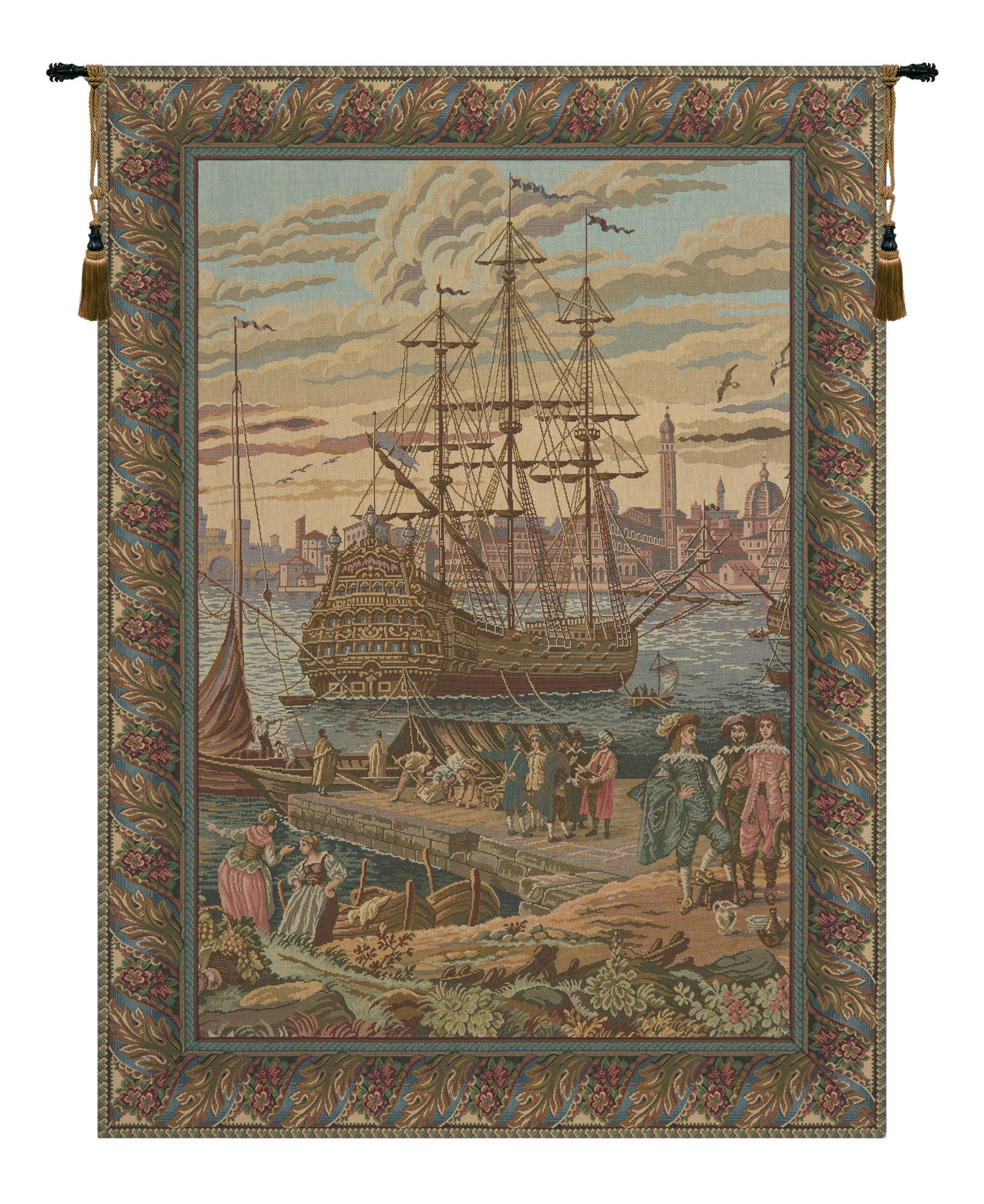 The Galleon I is an Italian jacquard wall tapestry. The artwork comes from an 18th century painting by Francesco Guardi detailing the activities of the Venetian port. This extract from the painting focuses on a huge galley in the bay and the merchants waiting for arrival of the ship at port.