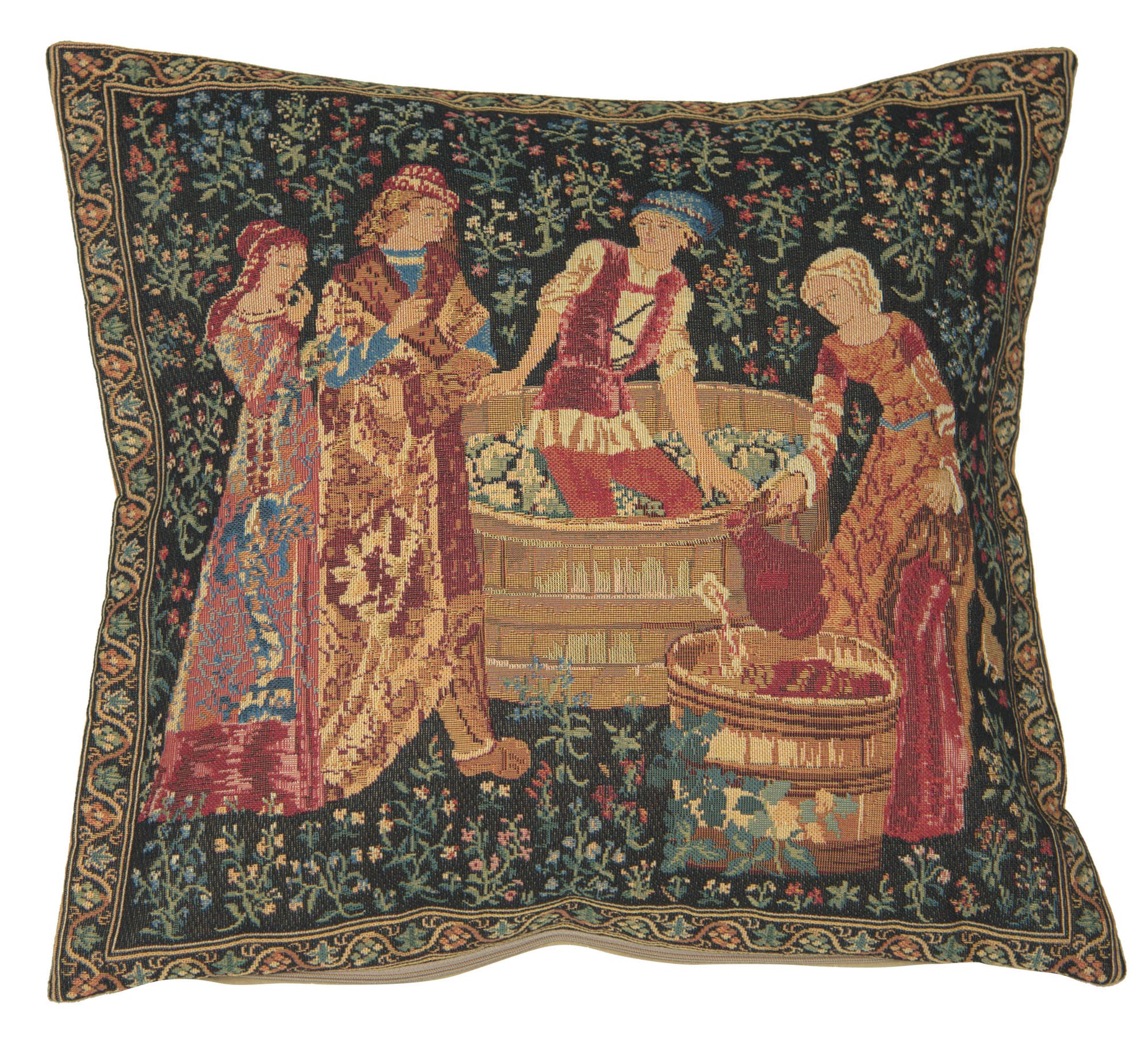 The Wine Press II woven European tapestry cushion cover features a medieval scene of grapes harvest and wine making. In this medieval scene we see the villagers crushing grapes with their feet to produce wine. The lady is seen collecting the wine from the large vat with a jug. Their costumes are elaborate, as they enjoy and revel in the spring time ritual of grapes harvest and the production of wine for all to enjoy.