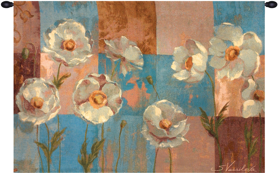Whispering Flowers tapestry features a modern look with a background of pink, blue and brown squares and small white and yellow flowers scattered about in the foreground.