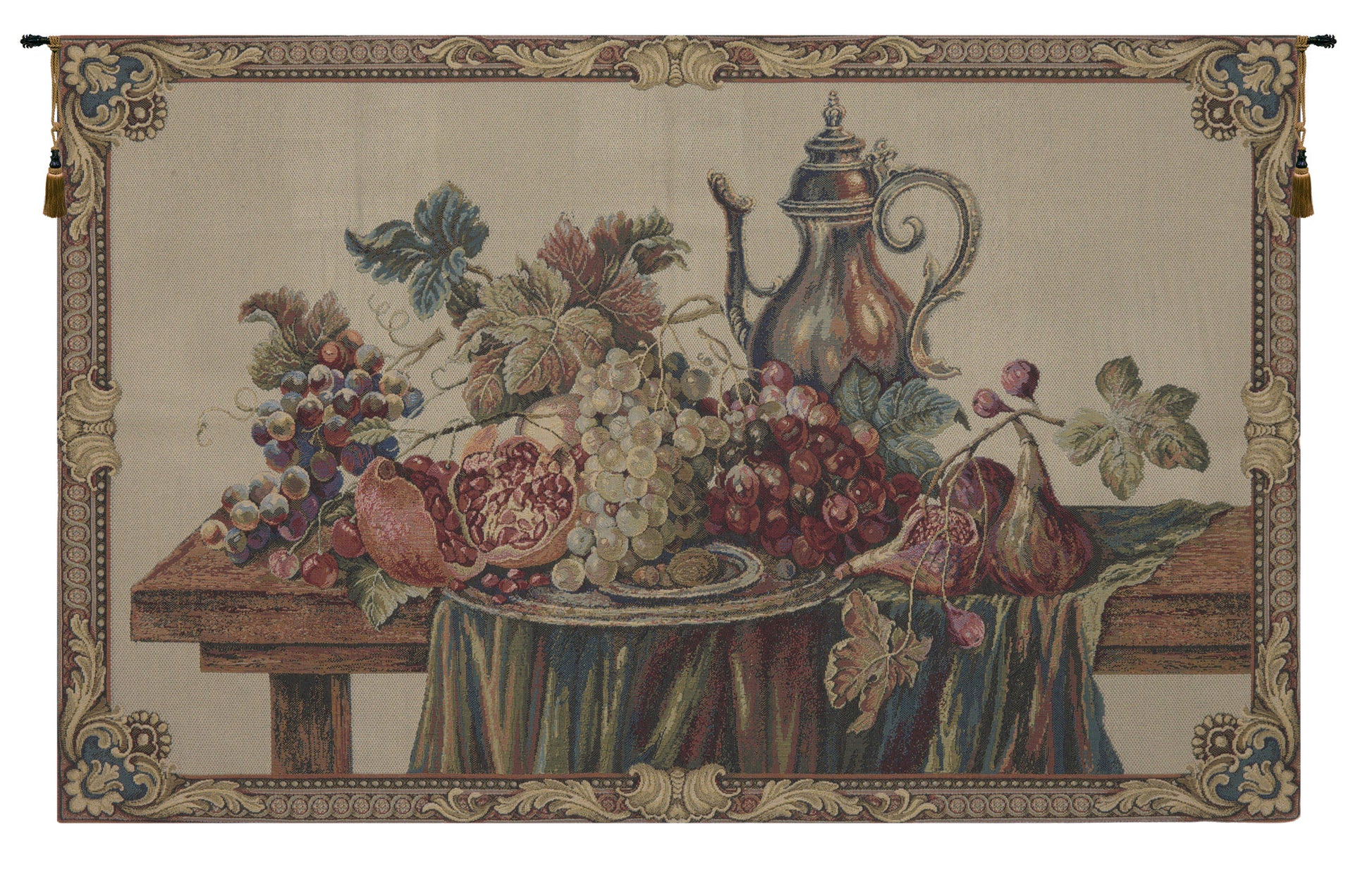 Apparence Still Even Rood Italian woven tapestry features a still life image. In this stunning tapestry we see a silver tray and pitcher surrounded by an array of fruit and leafy foliage. This scene is completed with a vibrant red background and ornate gold border.