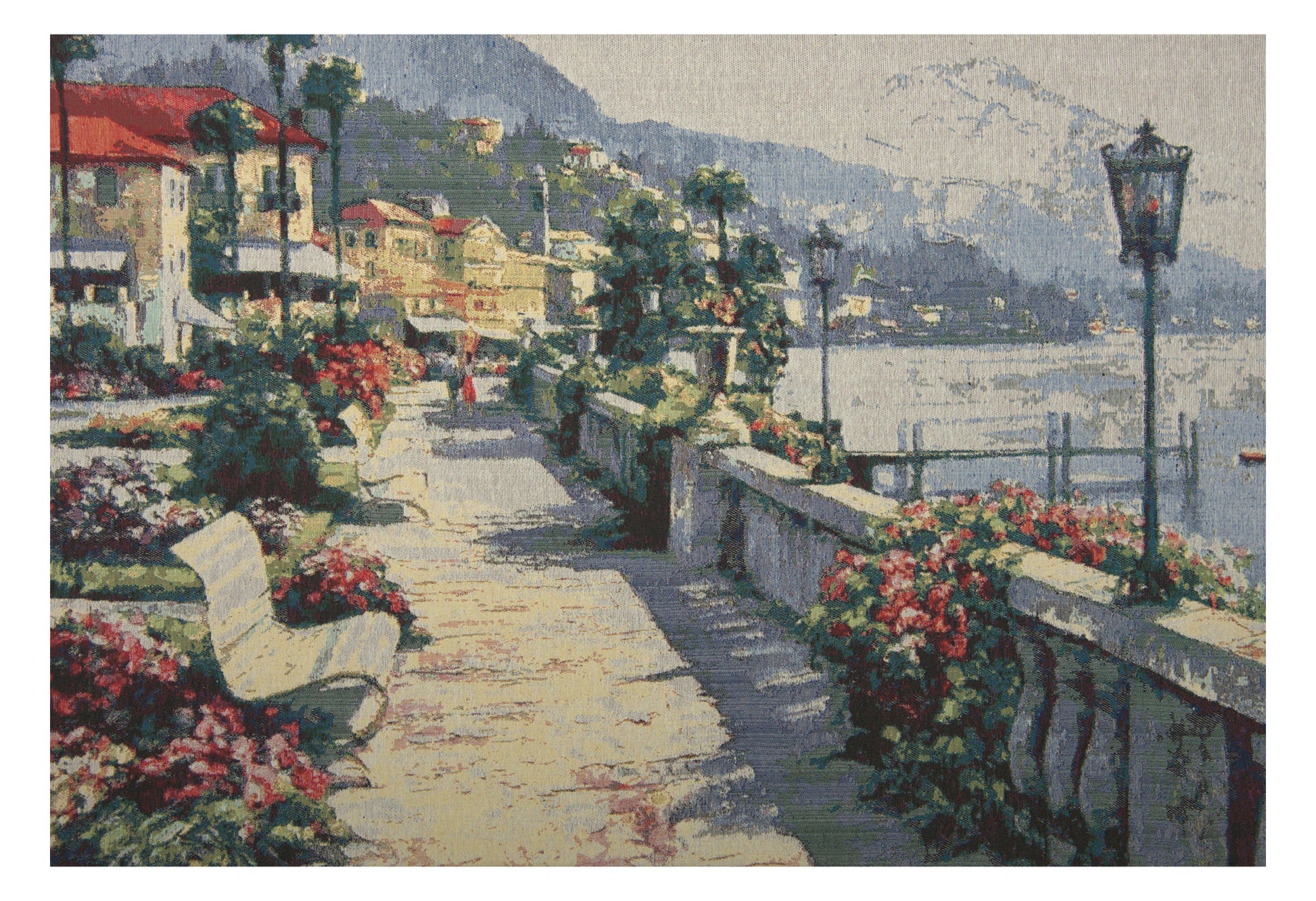 Noted as the “composer of color” and the best colorist of the post-impressionism period, artist Howard Behren interpreted grand vistas into expansive paintings. Our Bench by Lake Como Tapestry is a woven rendition of his famous oil painting “Along Lake Como”. Both the original and our tapestry depict a captivating scene of a row of empty benches looking out over the blue waters of Lake Como in Italy. This breathtaking place has been a vacation spot for the upper echelon for centuries. Today, you can bring the beauty and history of this incredible seascape to your home. The tapestry is made from cotton/poly/viscose blend with soft texture and gorgeous definition. Imported.