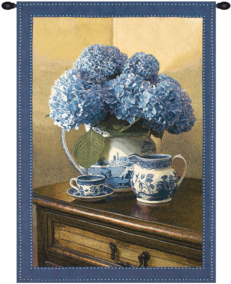 Blue Willow tapestry features a peaceful scene where we see a wooden side table with a vase of fully bloomed blue flowers sitting next to a blue and white tea cup and water pitcher.