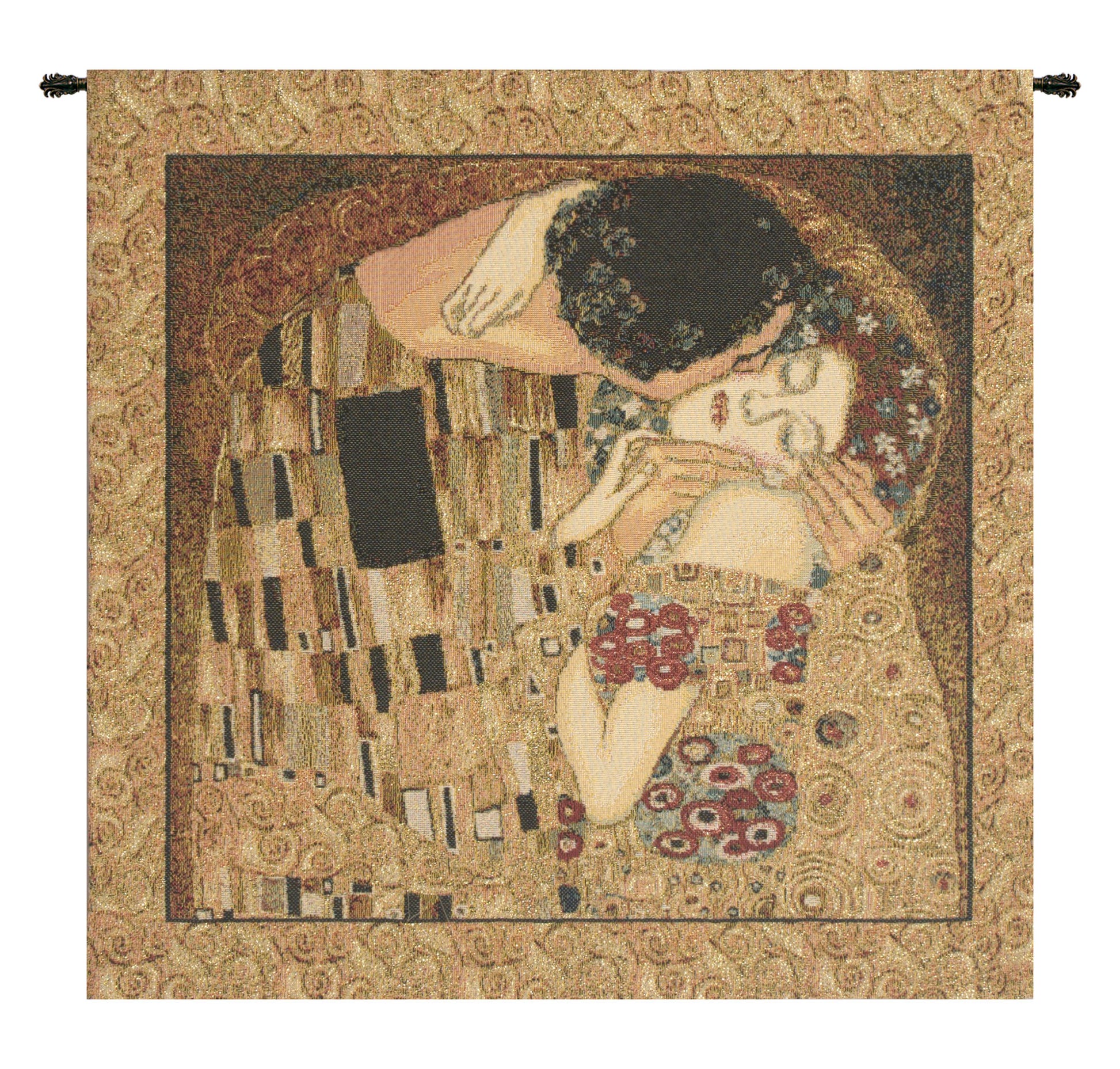 The Kiss Klimt is an Italian jacquard wall tapestry portraying the work of Gustav Klimt (1862 - 1918). In 1908, Klimt unveiled The Kiss, which depicts a man bending down to press his lips on the welcoming cheek of a lover, whose closed eyes and tight-lipped smile hint at rapture. The auriferous flourishes and the blending of rectangular features on the male figure with circular counterparts on his partner. There’s a mix of east and west, like so much else in Vienna, as well as a hope for harmony.