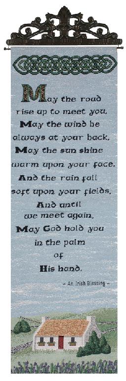 The Road Rises tapestry bell pull features a blue background with country cottage at the bottom. Also featured is the irish blessing, "May the road rise up to meet you, May the wind be always at your back, May the sun shine warm upon your face, and the rain fall soft upon your fields, And until we meet again, May God hold you in the palm of His hand".