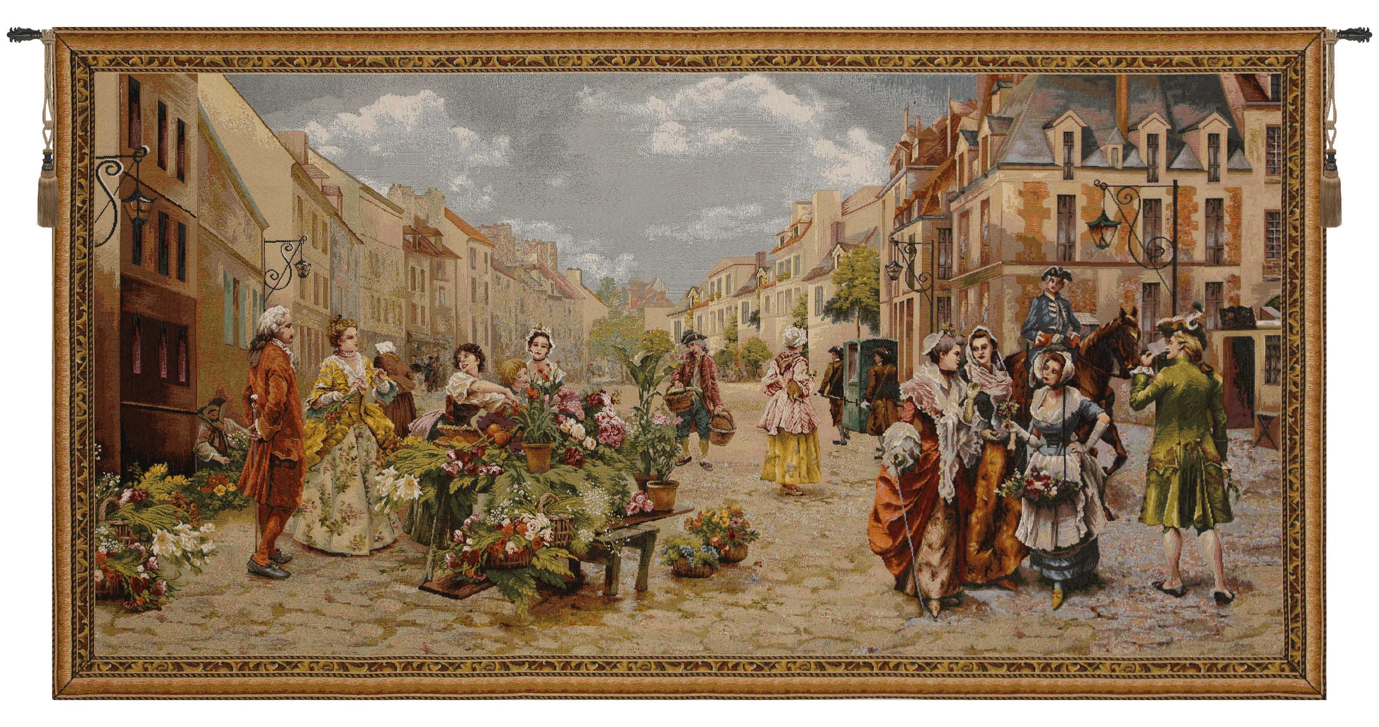 The "Victorian Flower Market" tapestry transports viewers to a lively cobblestone street of the past, bustling with Victorian charm. At the heart of the tableau are the flower vendors, their stalls adorned with an array of blooms, adding splashes of color amidst the otherwise muted tones of browns, tans, soft blues, and greens. The market is a scene of activity and commerce, with patrons gathered around, admiring the floral offerings and engaging in lively conversation. Woven with meticulous detail, the tapestry evokes a nostalgic longing for simpler times, enhanced by its decorative frame that draws the viewer into the charming streetscape. Crafted in Turkey, this artwork not only celebrates Victorian aesthetics but also offers practicality with its easy-hang design, inviting admirers to bring a touch of history into their homes for enduring enjoyment.
