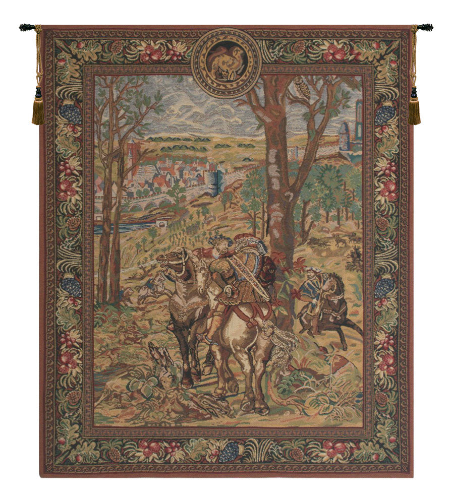 Vieux Brussels Belgian tapestry depicts one of twelve hunting scenes in the Maximillian series woven in the late 16th century for the Archduke Maximillian who was later to become Emperor. The central ram of Aries signifies the month of March and the central horseman is the Emperor Charles V.