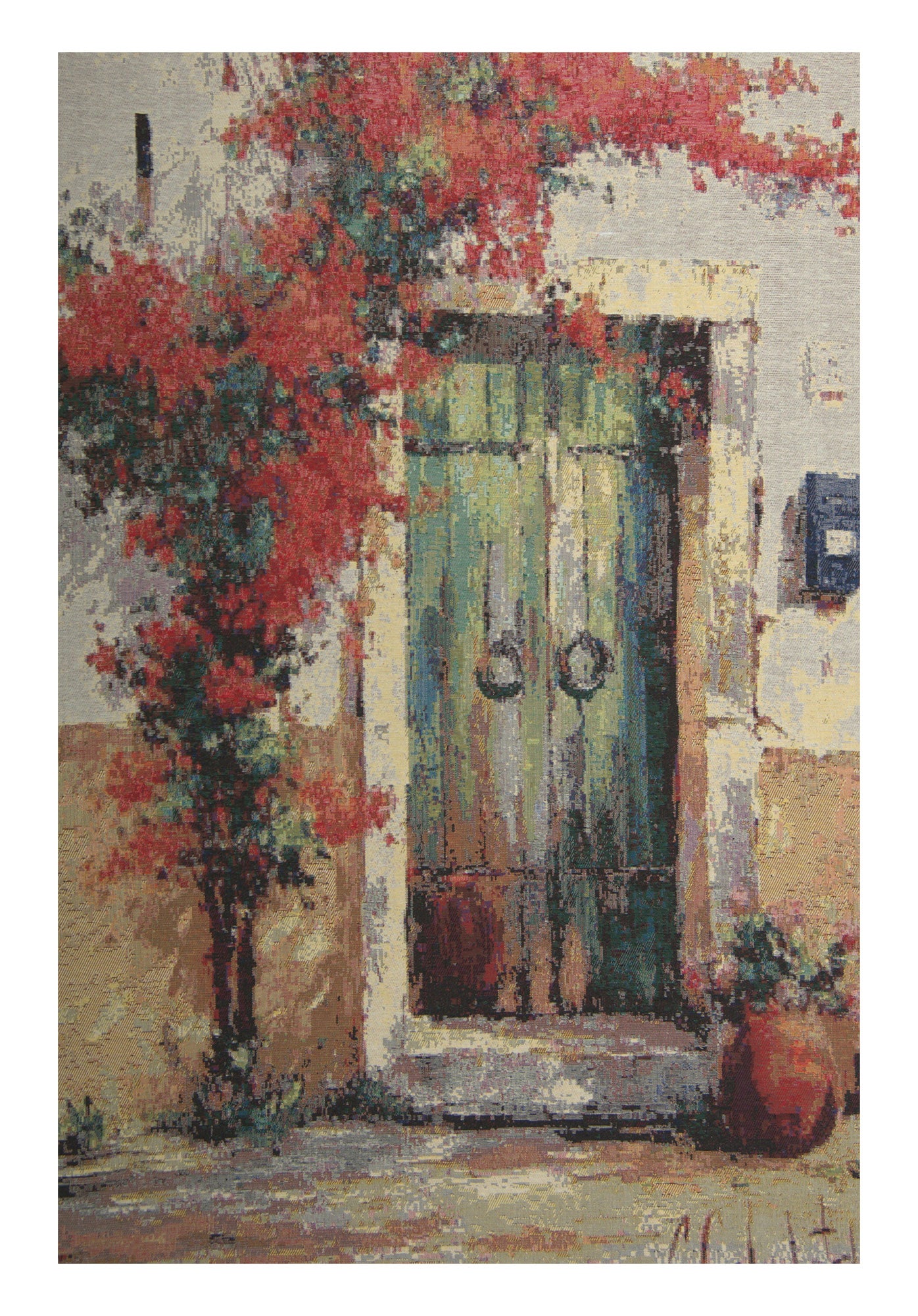 Intrigue and mystery abound wondering what is awaiting beyond with our enchanting Villa Flora Over Door Stretched Wall Tapestry. Evocative of fine European artwork of the 18th and 19th century, this woven wall art boasts rich, vivid color with an arc of red flowering vines over patinaed green double doors of a weathered villa. Perfectly place it on the wall opposite the front door or in the Old World style kitchen. This finely crafted tapestry is woven from cotton and polyester with viscose infused to create a silky texture and sheen. Imported.
