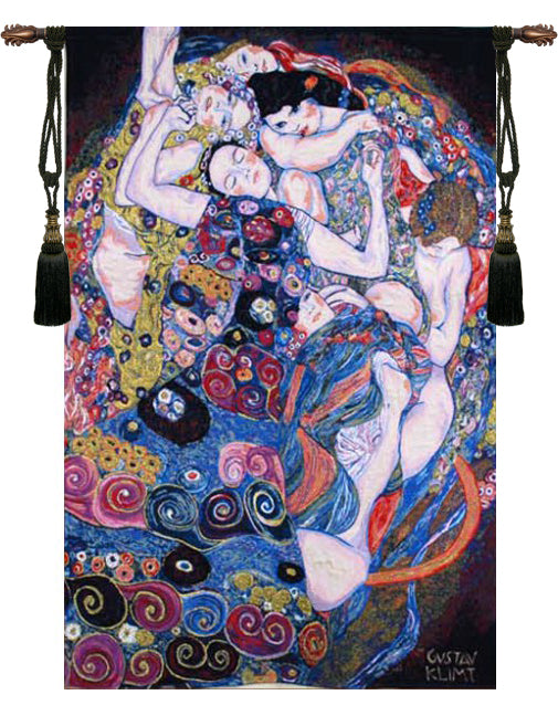 Virgin by Klimt is a Belgian jacquard woven wall tapestry. The artwork comes from a painting by Gustav Klimt completed circa 1913. In this surreal composition the entanglement of women has lost any realism, and thus all is absorbed in the decorative scheme. The association of beauty with such unnatural poses, indicates an allusion to life's ephemeral nature, a reflection of modern society.