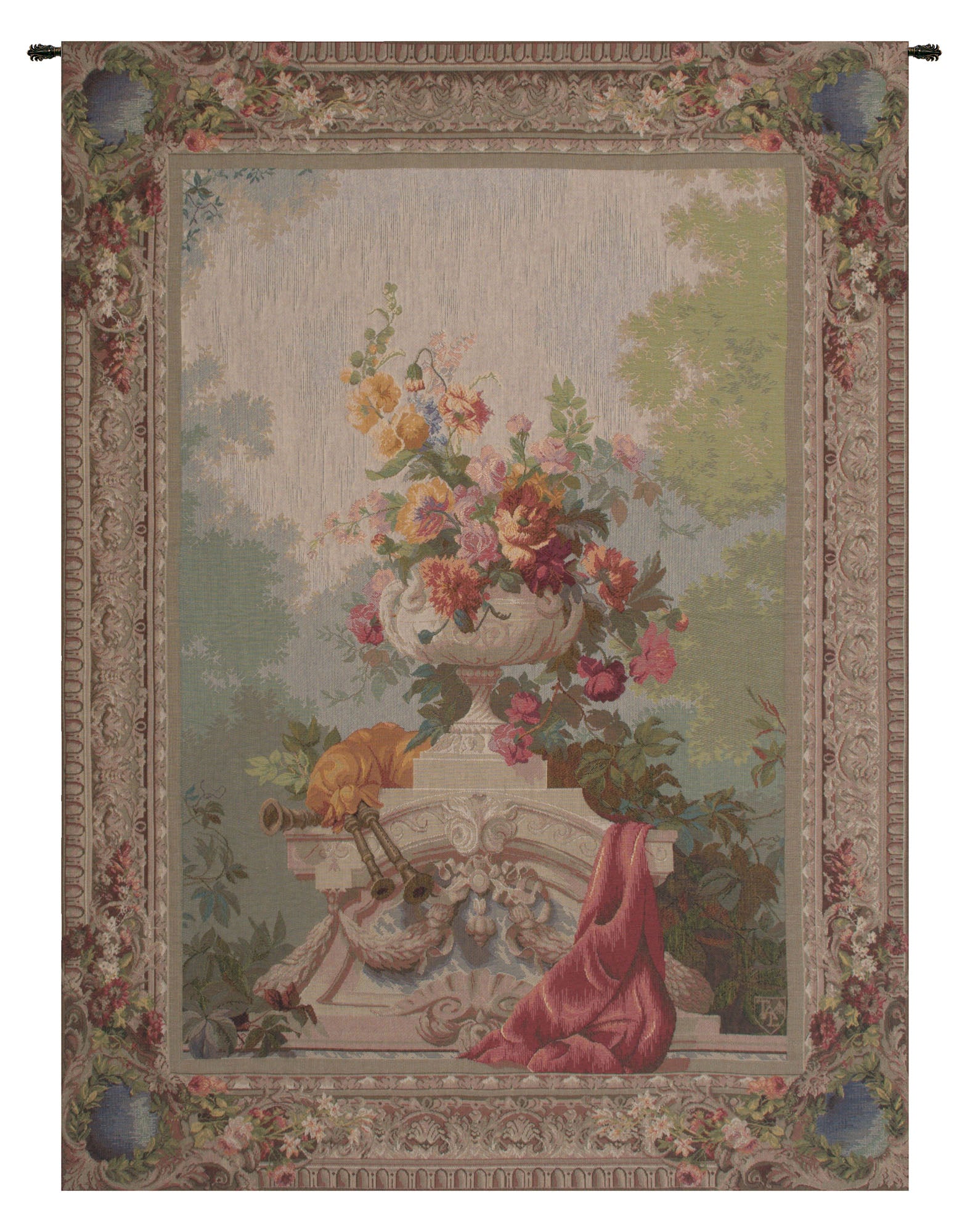 Bouquet Cornemuse is a 19th century bouquet tapestry in the Beauvais style. This loom woven jacquard wall tapestry depicts a beautiful vase of flowers on a pedestal accompanied by a set bagpipes.