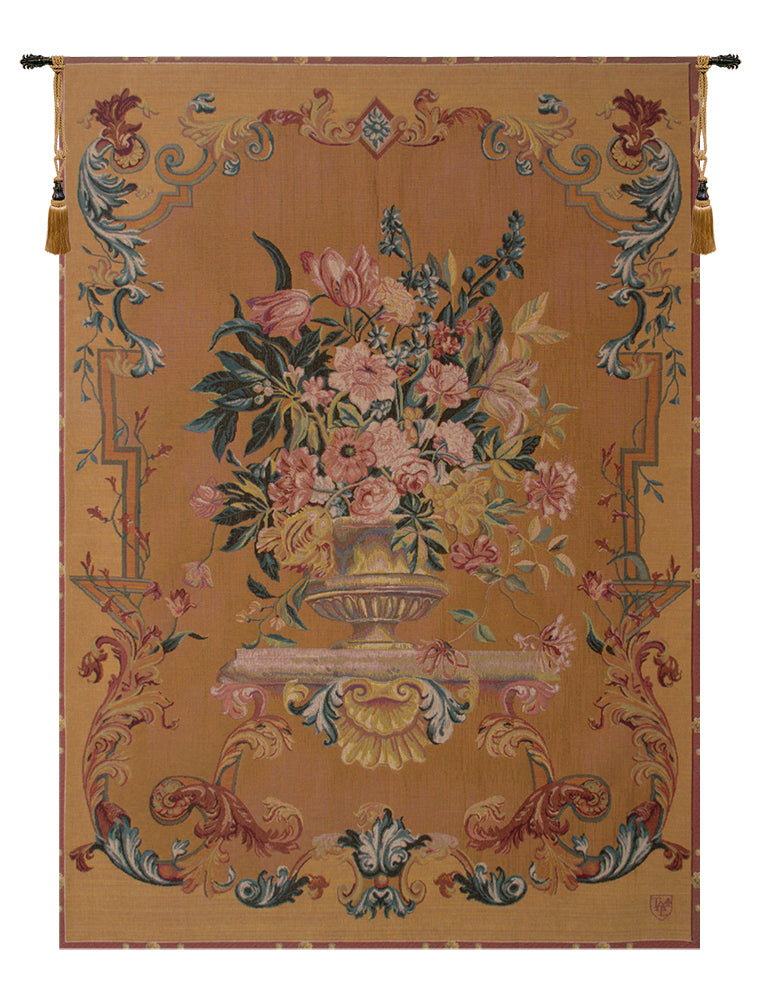 An 18th century English tapestry woven in Soho acts as muse for this French impressionist wall hanging. The English Bouquet, or Bouquet XVIII Tapestry presents an ornate vase with multicolored flowers over an orange background. This piece lends your interior design an ornately lavish atmosphere. For an eye-catching spectacle hang in the grand foyer or above the fireplace in the living room. The tapestry is woven in wool and cotton for luxurious color and texture. The colors represent all the wondrous colors of a secret garden. Backed with lining and tunnel for easy hanging. Woven in France.