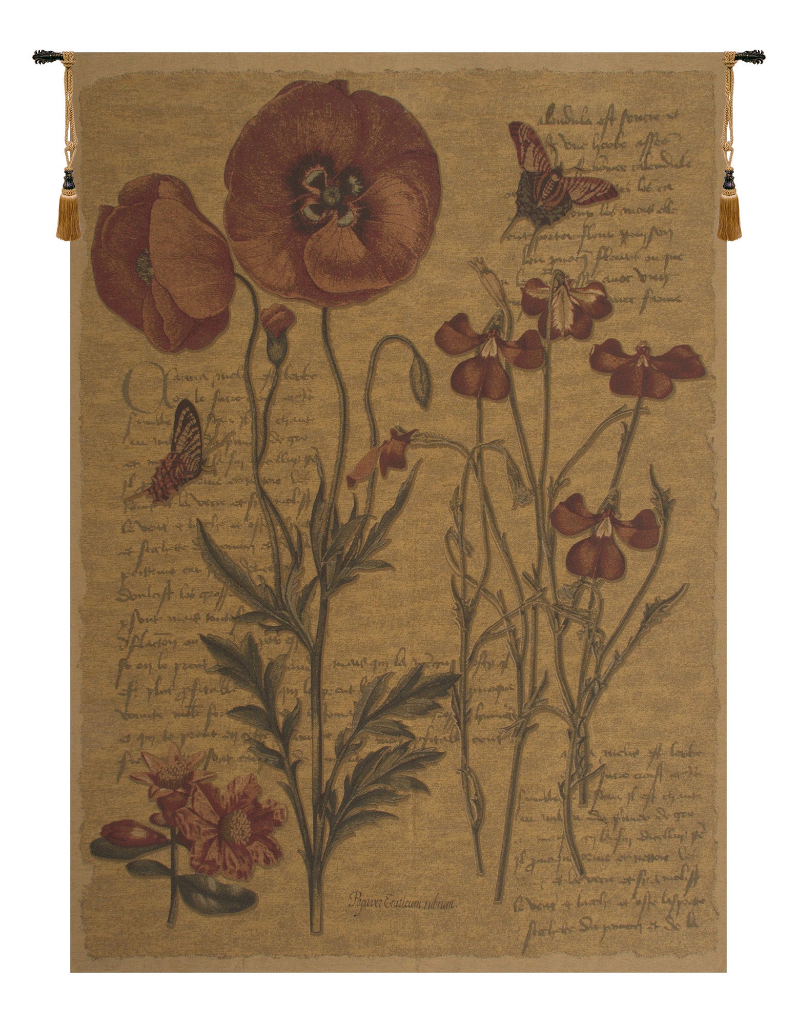 Flanders Poppies Belgian chenille tapestry is reminiscent of a drawing from a medieval herbal, you see the poppy in various stages of its life: just opening on the right; in full bloom in the center; and aging quickly at the bottom left. The Flanders poppy has been the symbol of remembrance and reverence for our war dead since World War I. John McCrae’s poem “In Flanders Fields” so inspired American Moina Michael that she began the tradition of the Flanders Fields Memorial Poppy. Due to her tireless championship, the American Legion adopted the poppy. Madame E. Guérin then took up the campaign internationally and both women are called the “Poppy Lady.”