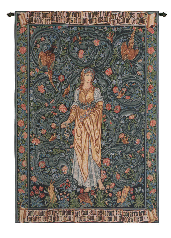 Flora I is a Belgian made jacquard woven wall tapestry. The design was inspired by the Flora tapestry (1885) created by Edward Burne-Jones for Morris & Co. Flora is the goddess of flowers and springtime, and exemplifies the aesthetics of the Aesthetic Movement of the 19th century.