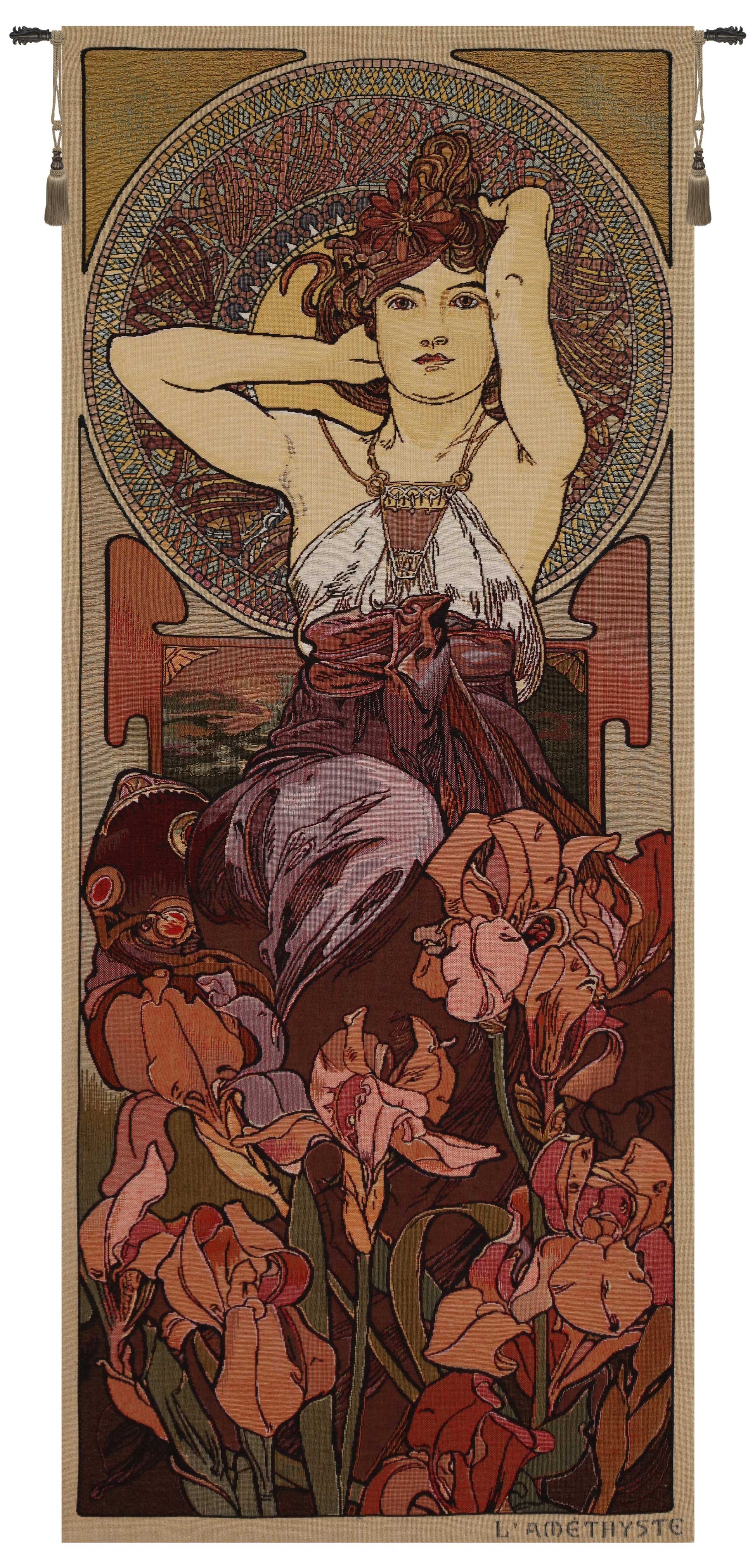 Drawing from Mucha's "The Precious Stones," this tapestry celebrates the character of Amethyste, or "L’ Amethyste." A woman, draped in a deep burgundy gown, sits gracefully with arms raised and hands entwined in her hair adorned with red flowers. Against a backdrop of stained glass-style mandala, irises in varying shades of red populate the foreground. The tapestry's predominant hues, ranging from reds to burgundies, enhance its captivating allure. This composition skillfully captures the essence of Mucha's style, blending elegance, floral motifs, and vibrant color schemes into a mesmerizing portrayal of Amethyste's beauty and grace.