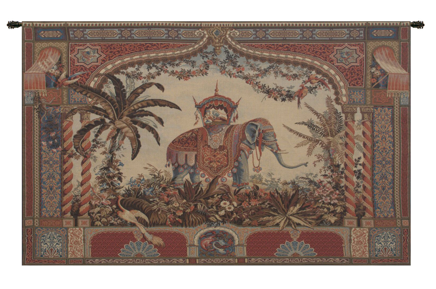 The Elephant is a European jacquard wall tapestry featuring an exotic Asian elephant covered with rich carpets and ornaments. The original design is from a famous 19th century tapestry on display in the Louvre Museum in Paris. It was woven at a carpet factory in Aubusson established by Alexis Sallandrouze, 1808-67. The design, attributed to Jean-Baptiste-Amédée Couder, 1797-1864, draws on a number of different sources. By introducing these exotic influences, the tapestry contributed to a revival of the decorative arts in France in the 1840's.