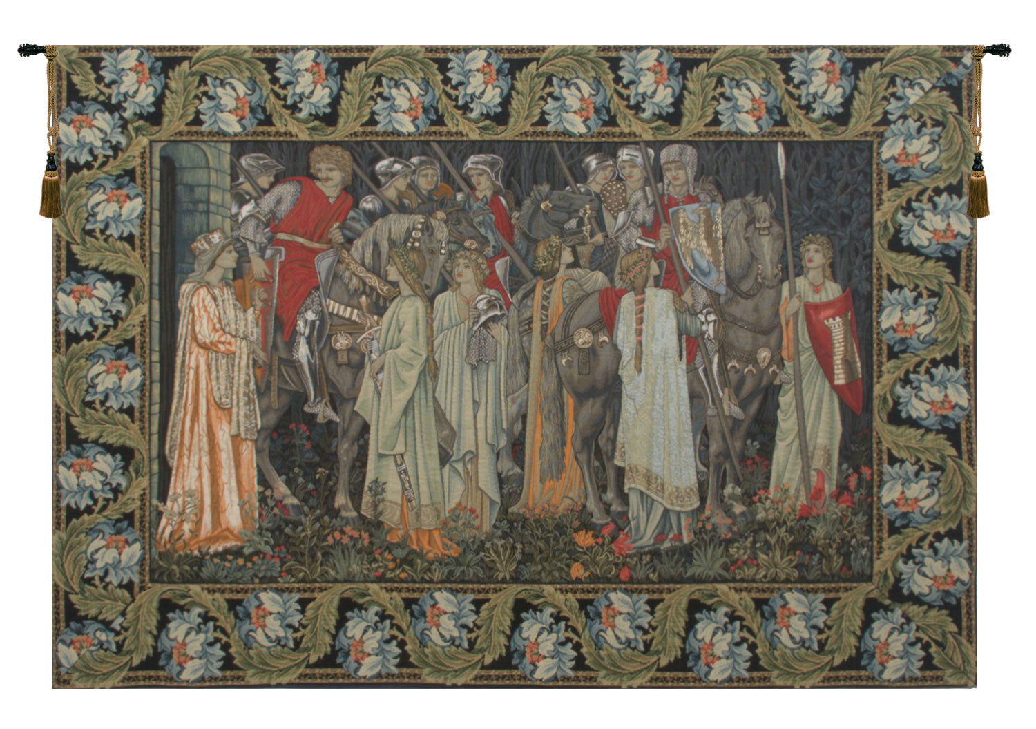 The Holy Grail (with border) is a European jacquard wall tapestry based on the original tapestry designed by Edward Burne-Jones and woven by Morris & Co. in 1895-96. It is one of the six panels illustrating the story of the Quest for the Holy Grail. This work represents the arming and departure of of knights of the Round Table.