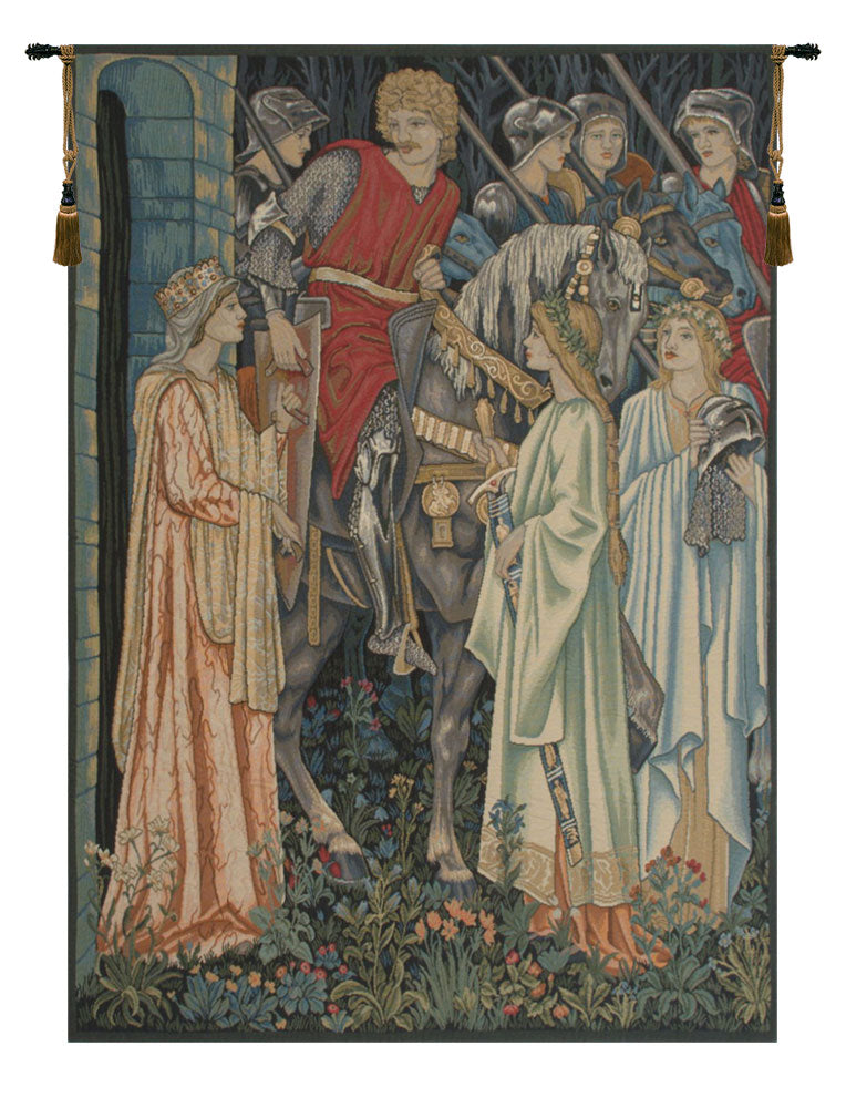 The Holy Grail (Left Panel) is a Belgian made jacquard woven wall tapestry. The original design is by Edward Burne-Jones and was woven by Morris & Co., in 1895-96. It is one of the six panels illustrating the story of the Holy Grail. It represents the arming and departure of of knights of the Round Table.