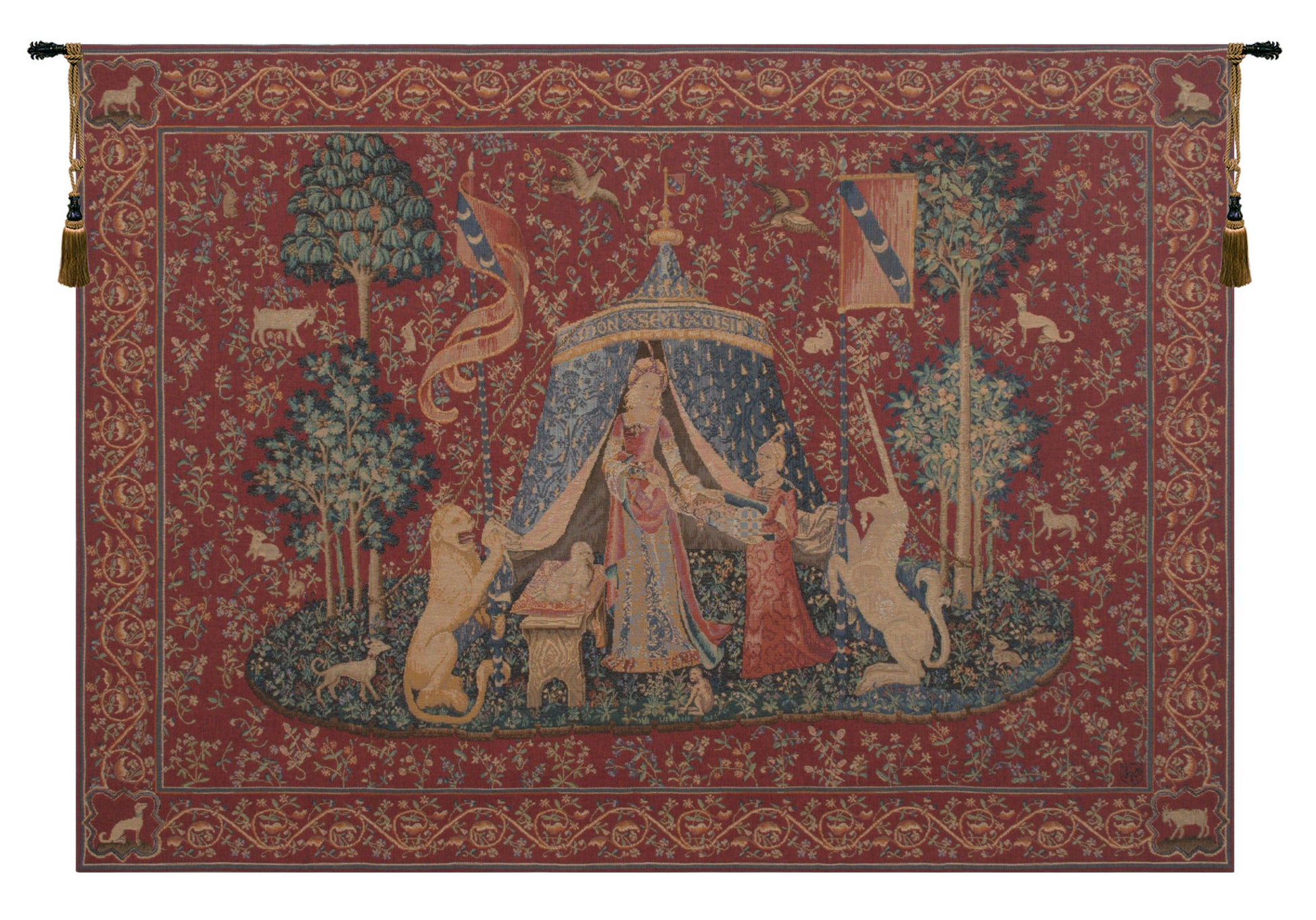 A Mon Seul Desir I is a French impressionist jacquard woven tapestry wall hanging inspired by one of the scenes from the "Lady and the Unicorn" tapestry series created in the late 15th century. The series explores the 5 known senses, and this sixth tapestry (A Mon Seul Desir "To My One Desire") the meaning behind the sixth piece is left to subjective interpretation. In this panel of the series the Lady is seen here placing her necklace into her jewelry box amidst a deep primary red background with dancing mille de fleurs. Originally from the medieval period of France, this work is a detail from the tapestry rediscovered in 1841, originally commissioned by the La Viste family. The lavish atmosphere that this fine art textile creates make it an ideal piece to add to your home décor collection.