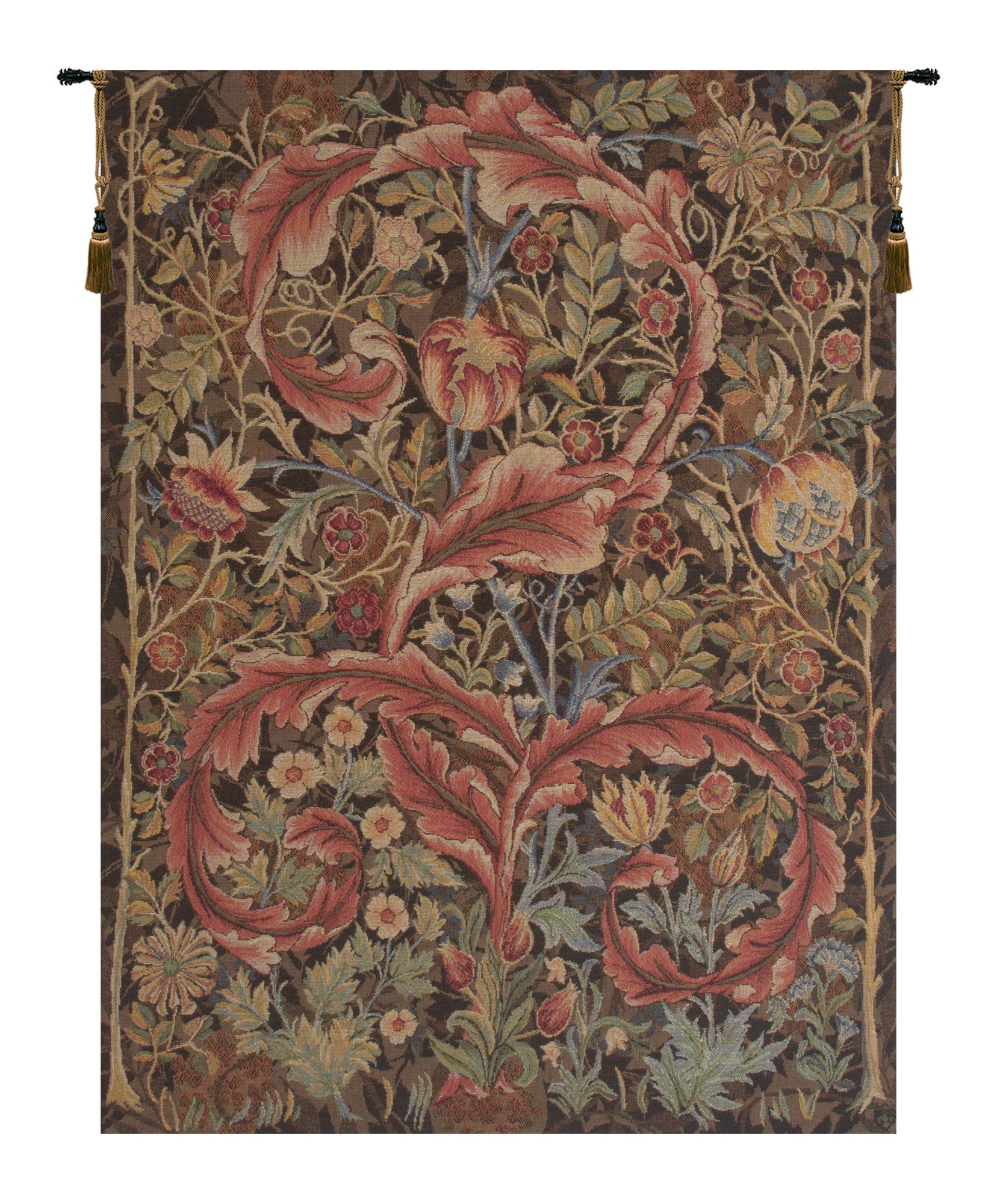 This jacquard wall art tapestry Acanthe, or Acanthus, is woven on a brown background. It is inspired from a William Morris embroidered panel done in 1898. This work portrays large acanthus leaves on a floral background.
